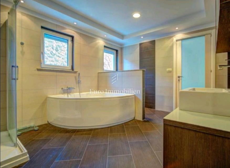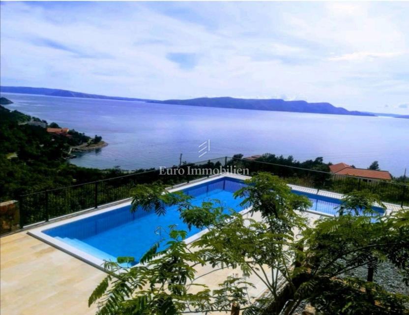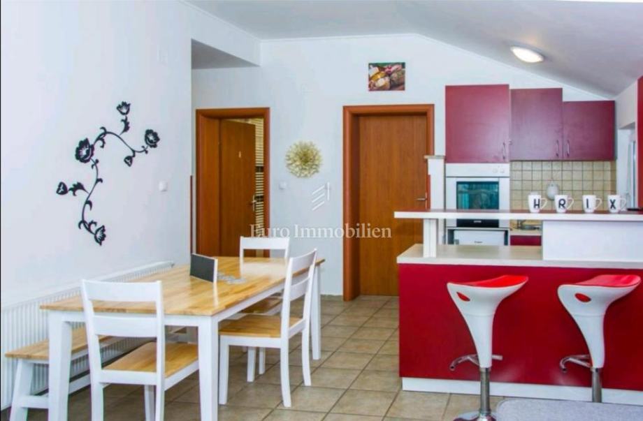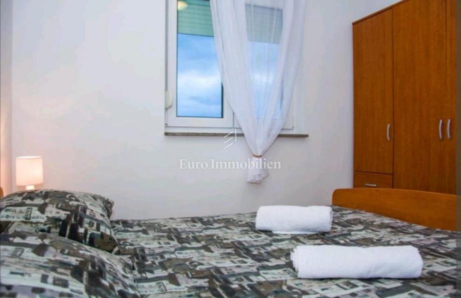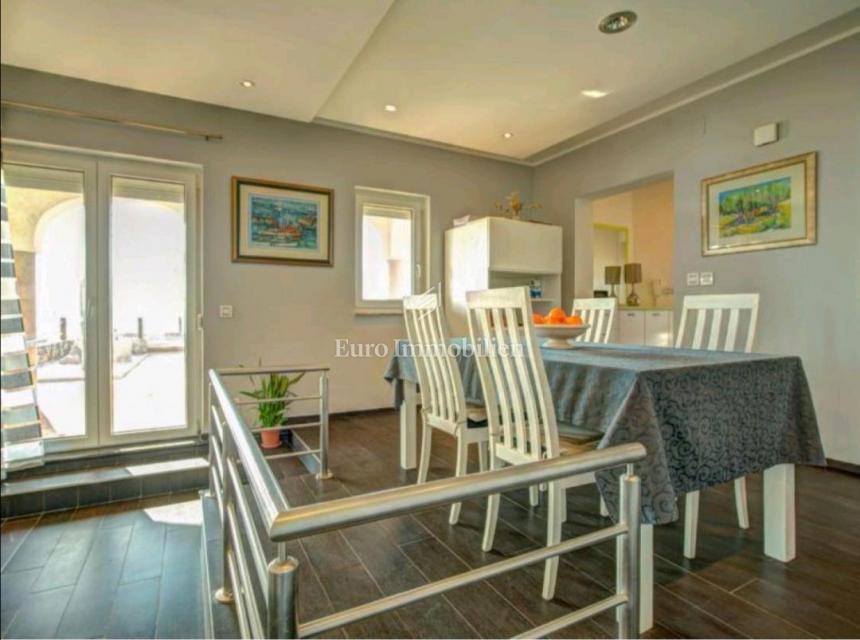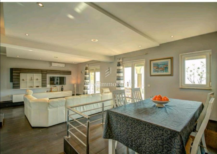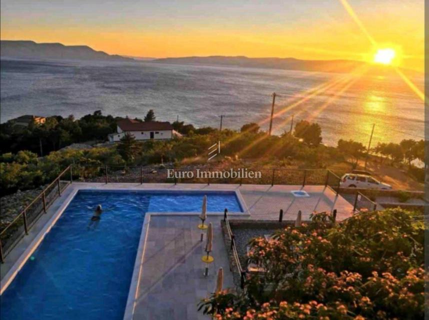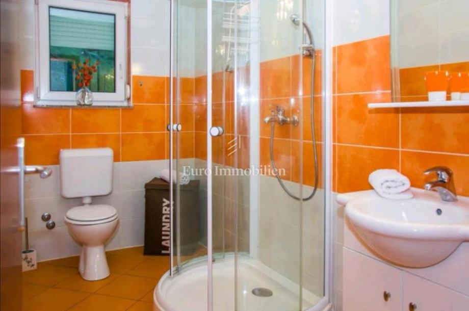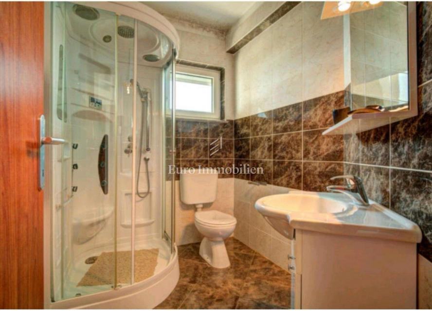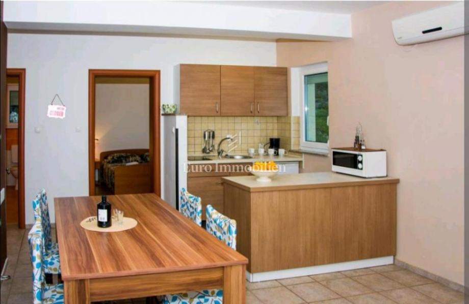 Prodajemo kuću sa pet stambenih jedinica, konobom, bazenom od 64 m2. Kuća se sastoji od prizemlja, dvije etaže i potkrovlja. U prizemlju se nalazi garaža, dvosobni stan sa dvije kupaone, kuhinja, blagovaona i dnevni boravak otvorenog tipa. Stan u prizemlju ima podno grijanje. Na prvom i drugom katu nalaze se četiri dvosobna stana sa prekrasnim pogledom na more. Jedan apartman ima centralno grijanje na pelete. Cijela kuća je klimatizirana. Potkrovlje se može prenamjeniti u stambeni prostor. Nekretnina u uhodanom turističkom najmu. Lokacija prekrasna idealna za odmor i uživanje.