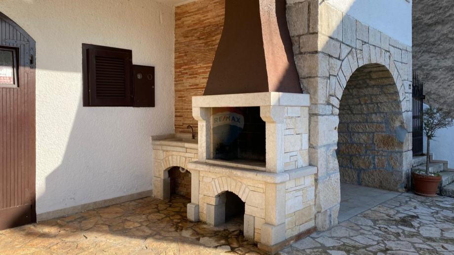 U prizemlju se nalazi natkriveni prostor s roštiljem, prostrana konoba, spremište, WC, prostor za druženje s ljetnom kuhinjom, spremištem.