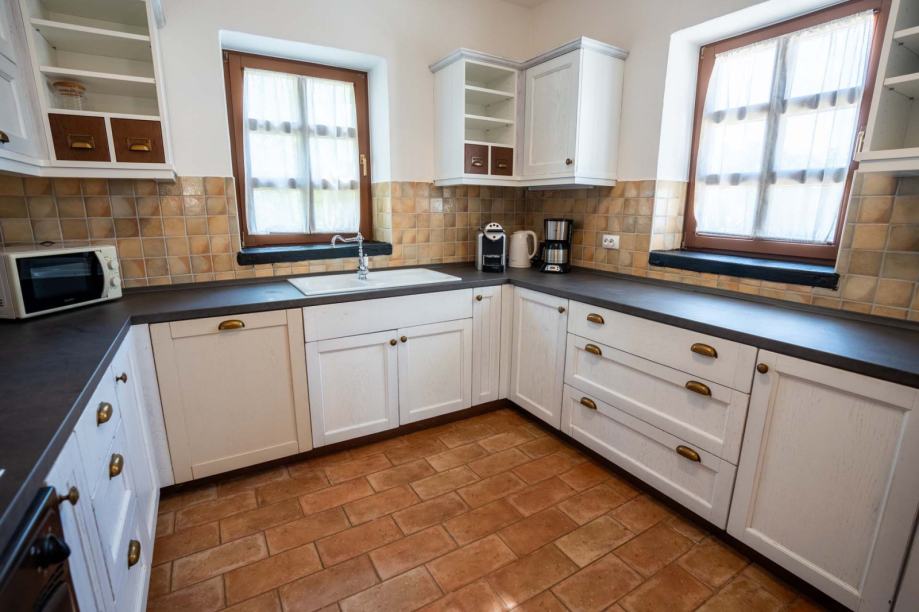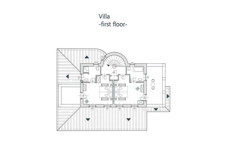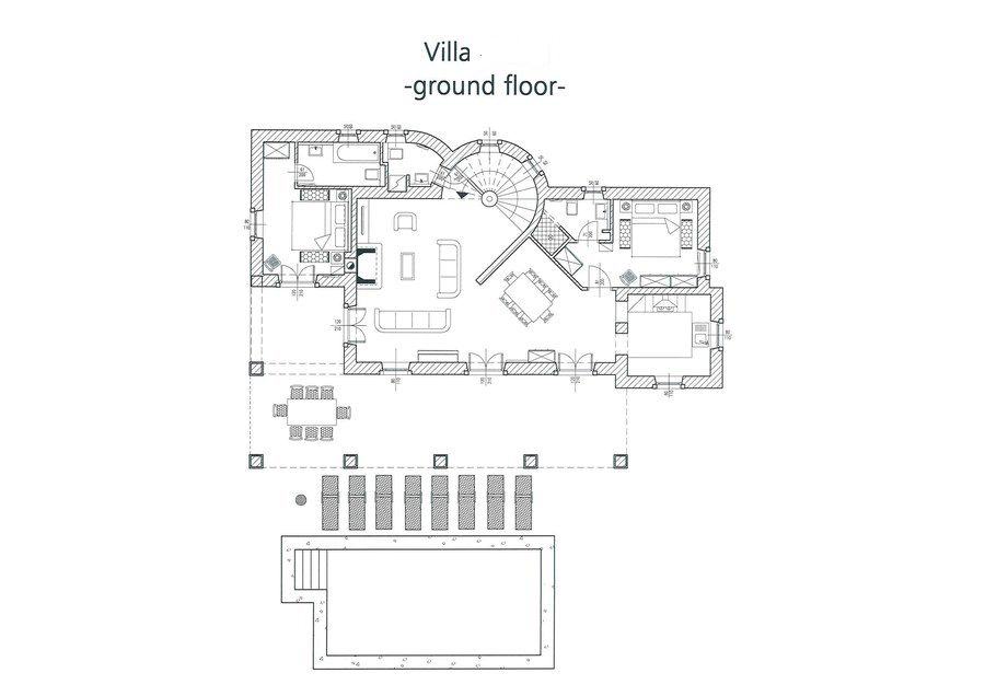 Prizemlje vile sastoji se od predsoblja, kuhinje sa blagovaonicom , prostranog dnevnog boravka sa kaminom i izlazom na natkrivenu terasu, spavaće sobe sa kupatilom .