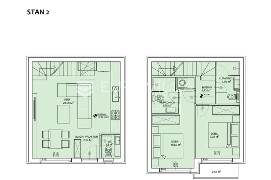 In the beautiful small town of Sv. Petar na Moru, a modern residential building with 9 residential units is being built at a distance of 180 m from the beach.The duplex apartment S2, located on the ground floor and on the first floor of the building with an area of 72.55 m2, consists of a spacious...