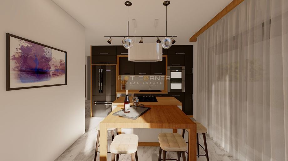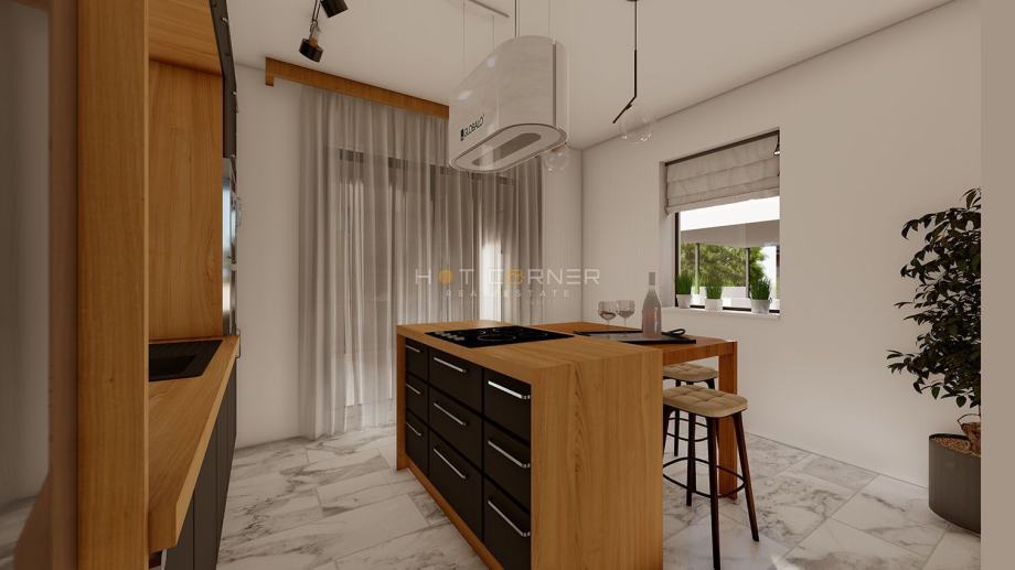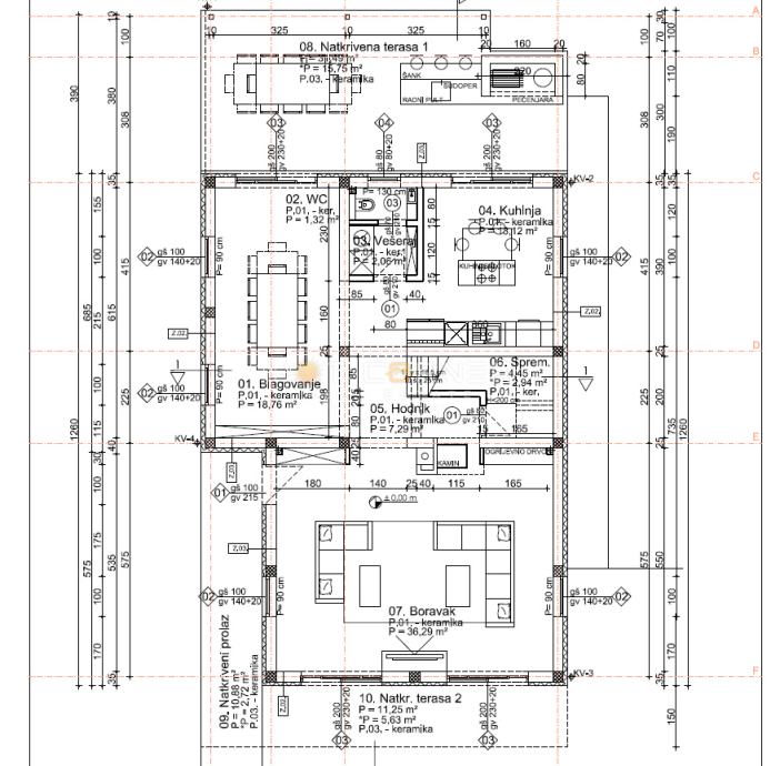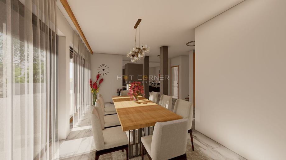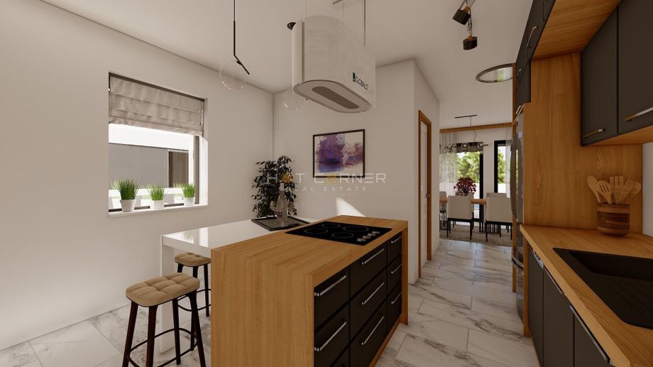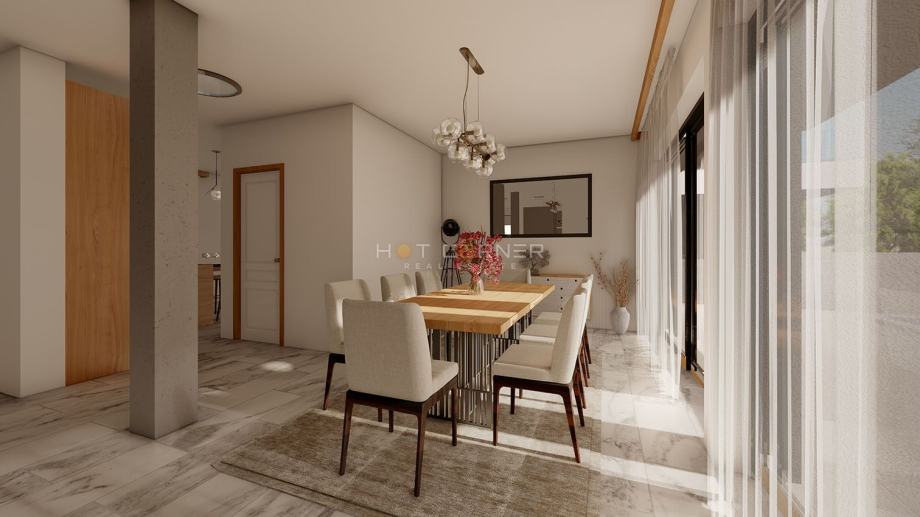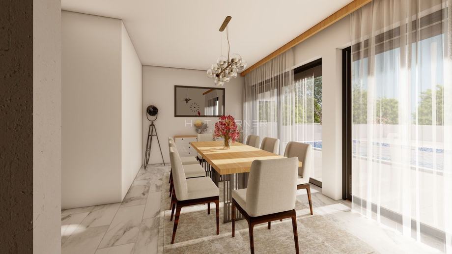 - u prizemlju : ulazni hodnik, verešaj, wc, spremište ( za kotlovnicu ), kuhinju, blagovaonicu, prostrani dnevni boravak te dvije natkrivene terase. Jednu sa prednje strane kuće koja vodi na bazen i drugu sa stražnje strane kuće gdje je predviđen roštilj.
