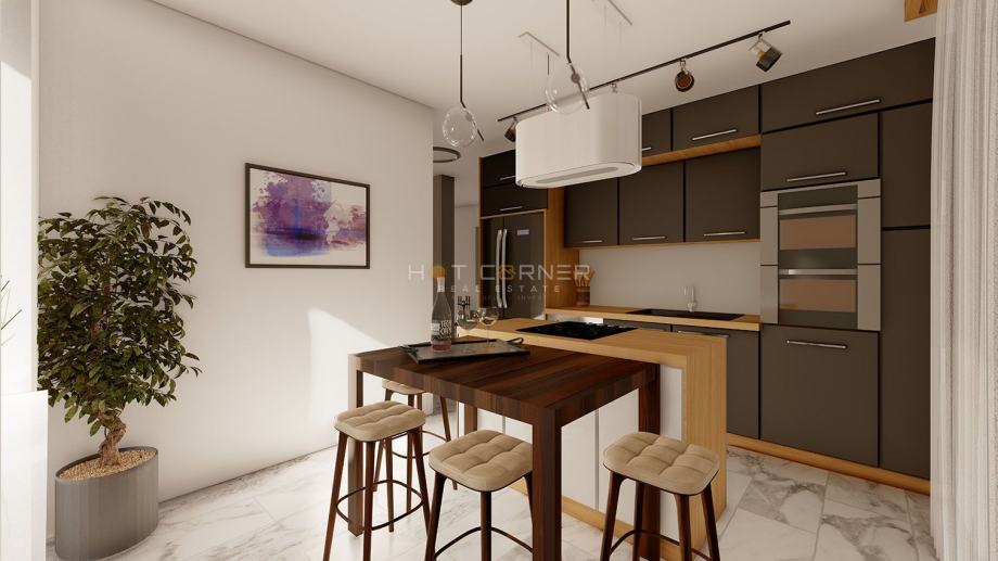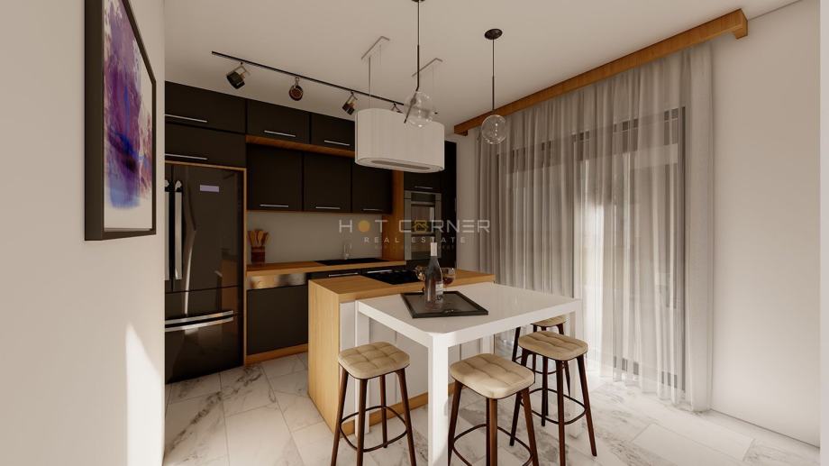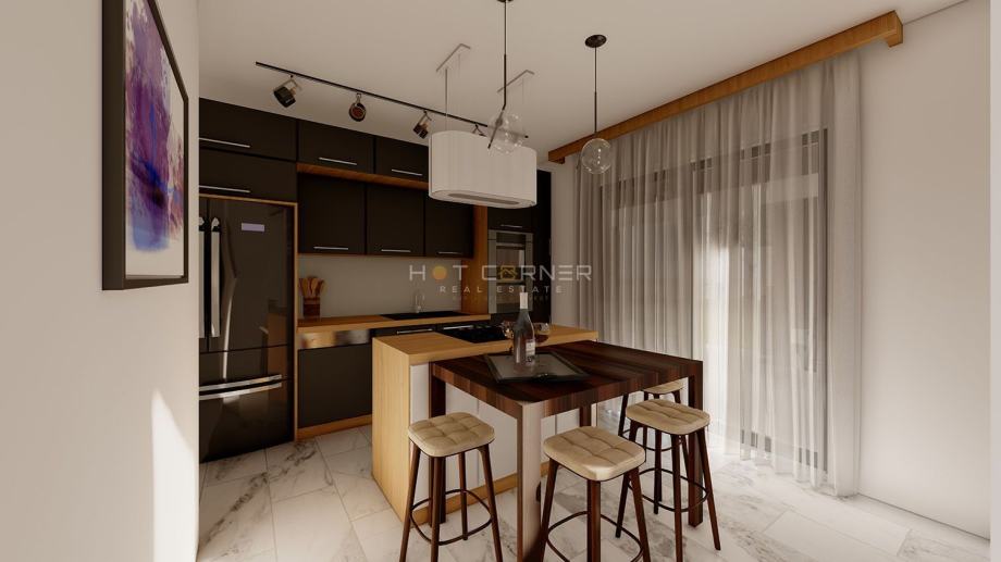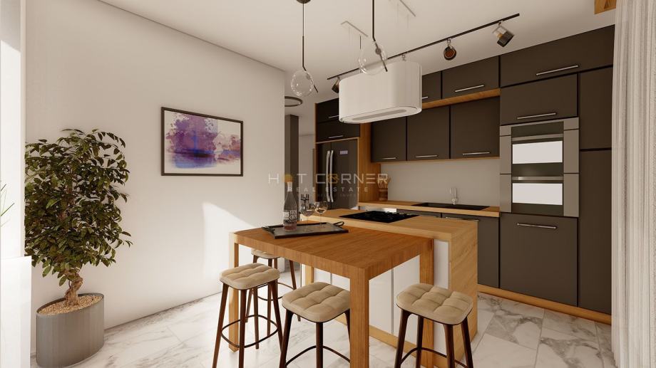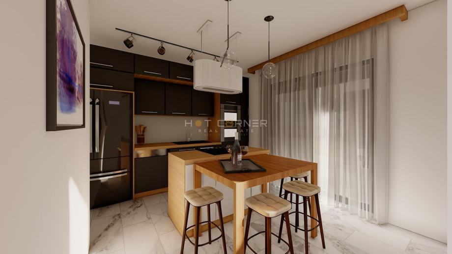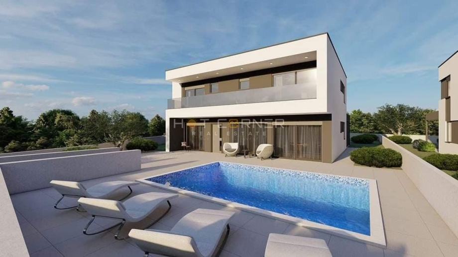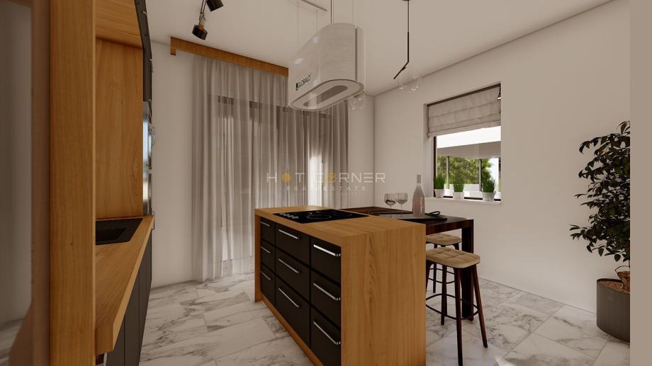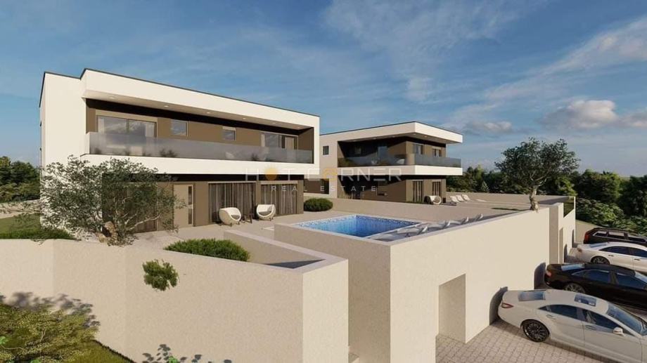- u prizemlju : ulazni hodnik, verešaj, wc, spremište ( za kotlovnicu ), kuhinju, blagovaonicu, prostrani dnevni boravak te dvije natkrivene terase. Jednu sa prednje strane kuće koja vodi na bazen i drugu sa stražnje strane kuće gdje je predviđen roštilj.