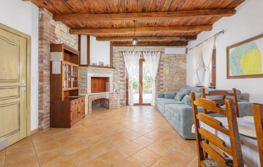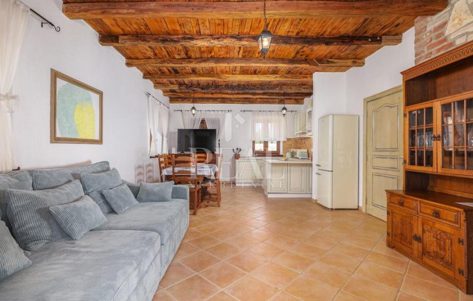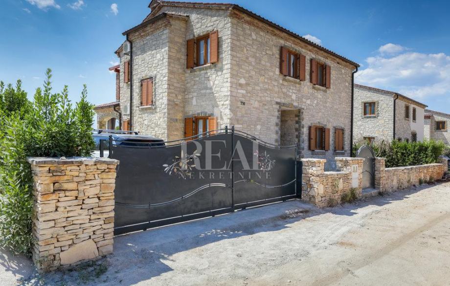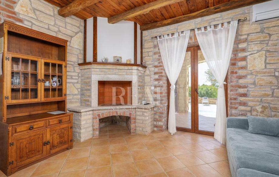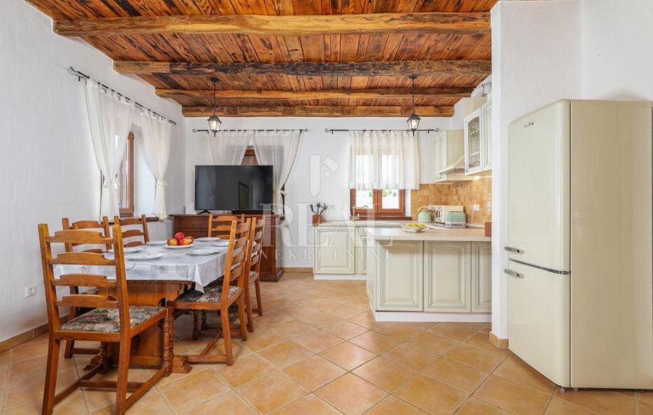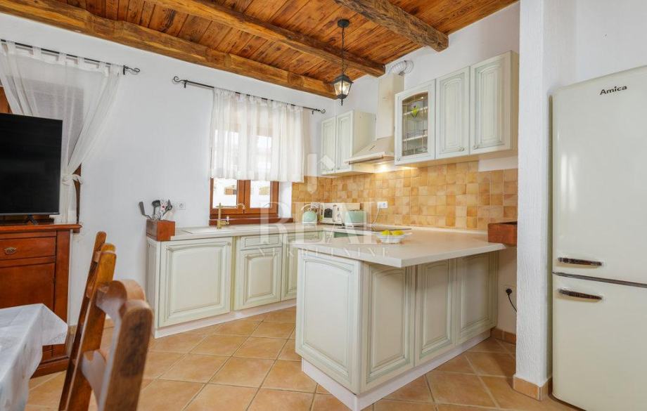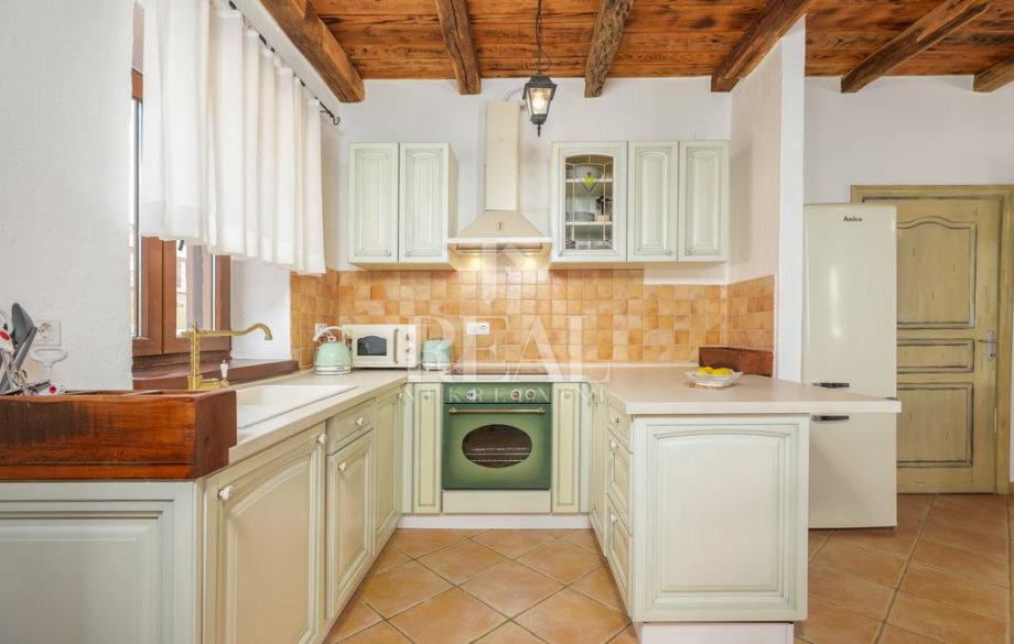 Radi se o samostojećem objektu koji se sastoji od prizemlja i kata. U prizemlju je smješten dnevni dio sa kuhinjom i blagavaonicom, kupaonica, ostava te jedna spavaća soba i lijepa veća natkrivena terasa sa pogledom na bazen i prirodu. Na katu su dvije kupaonice i tri spavaće sobe od kojih jedna ima vlastitu kupaonicu a druge dvije imaju izlaz na terasu sa koje se vidi pogled na more i zelenilo.Grijanje je osigurano putem klimatskih jedinica , centralnog sustava na pelete te kamina na kruta goriva koji se nalazi u dnevnom dijelu.Na vanjskom dijelu je bazen, jacuzzi, tuš, i roštilj.