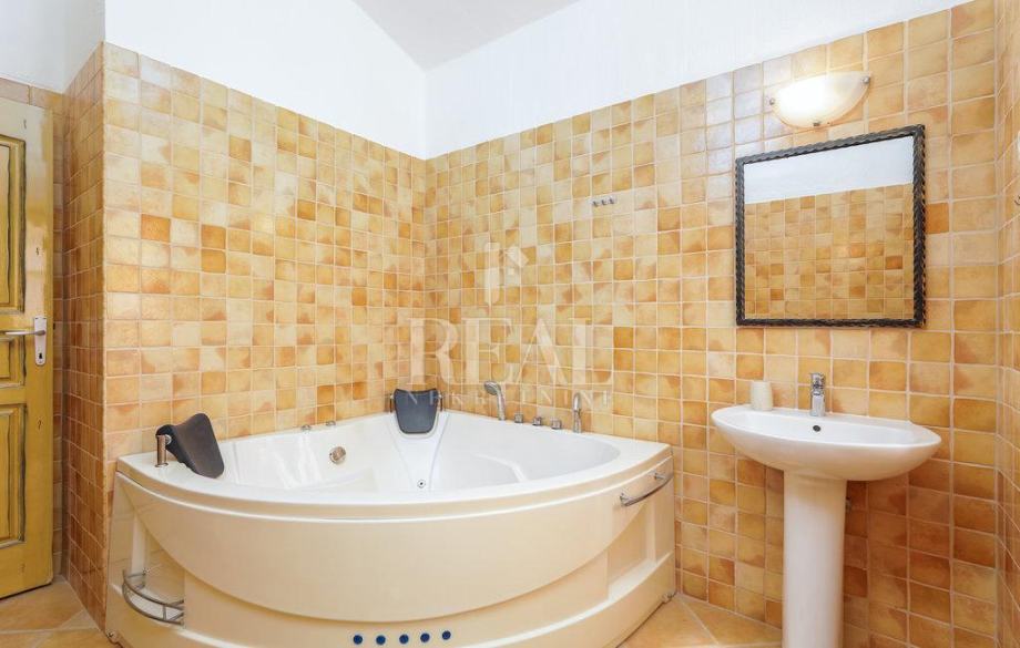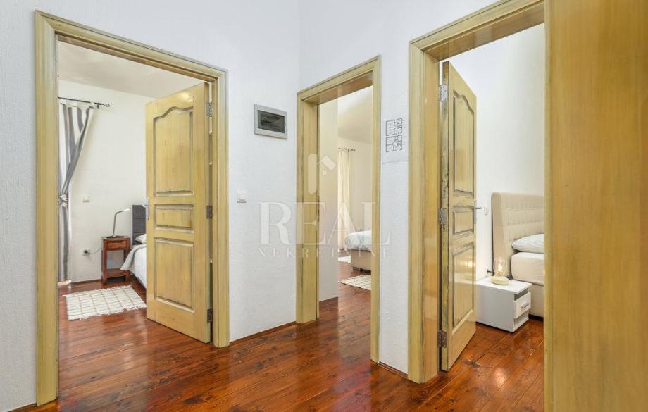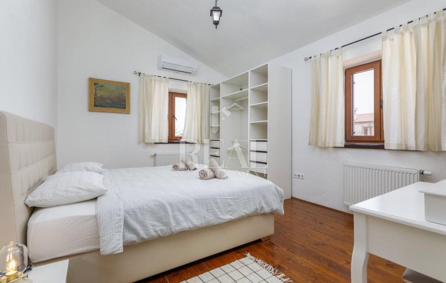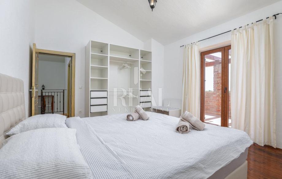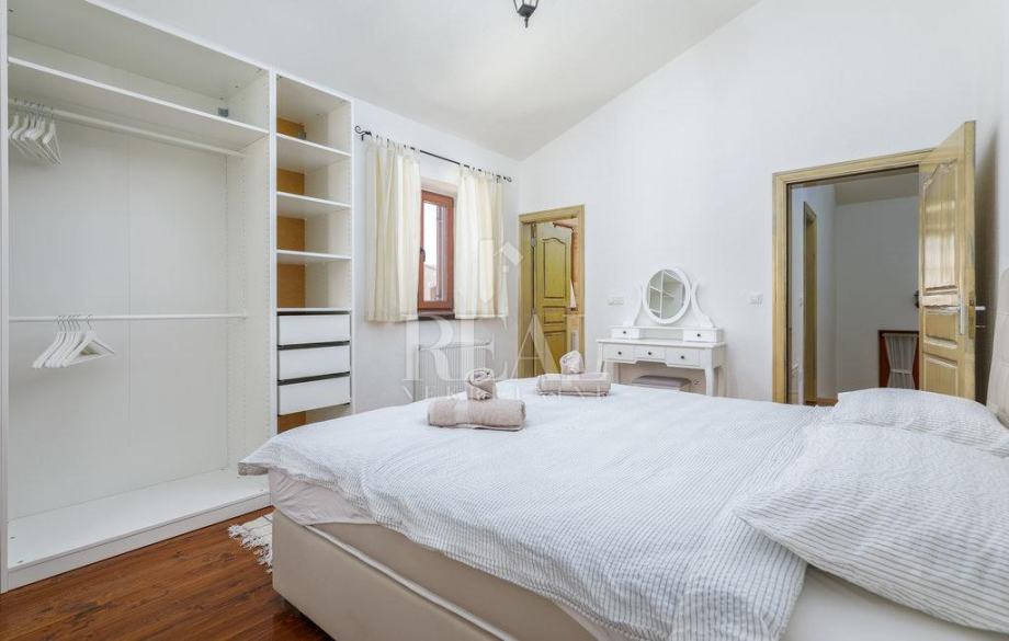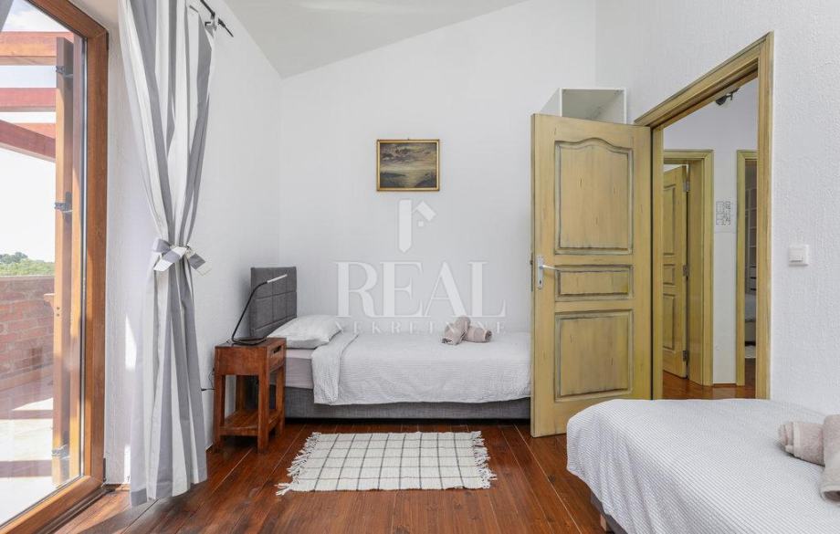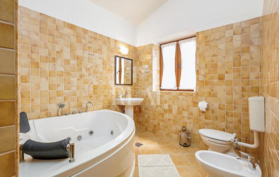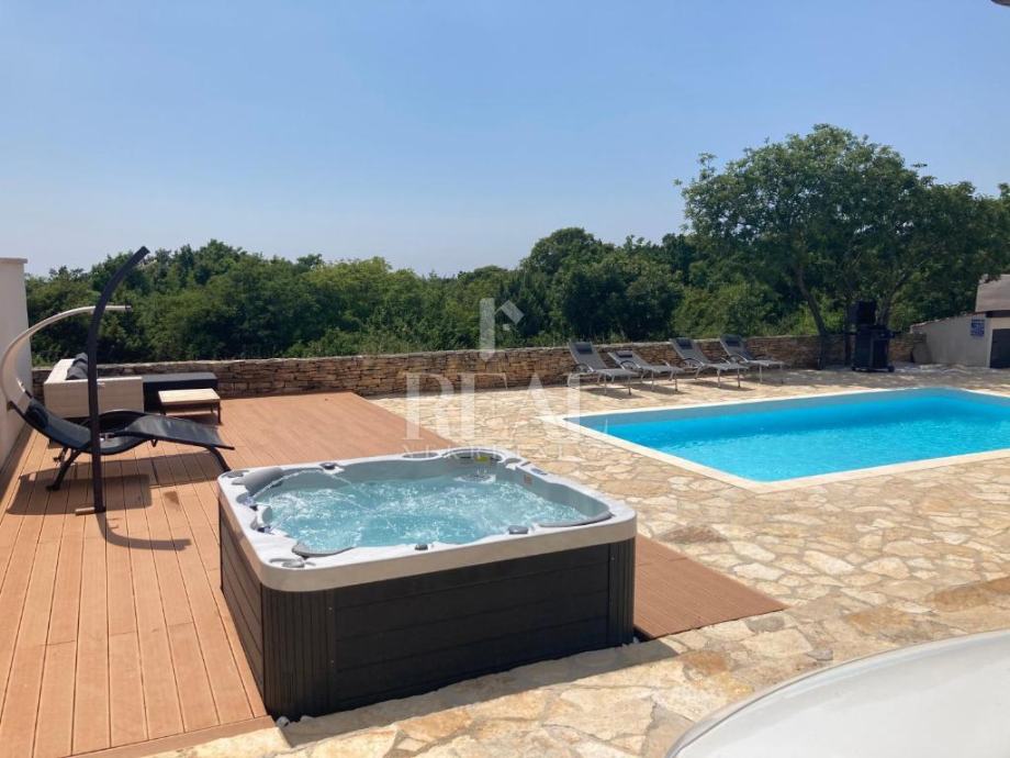 Radi se o samostojećem objektu koji se sastoji od prizemlja i kata. U prizemlju je smješten dnevni dio sa kuhinjom i blagavaonicom, kupaonica, ostava te jedna spavaća soba i lijepa veća natkrivena terasa sa pogledom na bazen i prirodu. Na katu su dvije kupaonice i tri spavaće sobe od kojih jedna ima vlastitu kupaonicu a druge dvije imaju izlaz na terasu sa koje se vidi pogled na more i zelenilo.Grijanje je osigurano putem klimatskih jedinica , centralnog sustava na pelete te kamina na kruta goriva koji se nalazi u dnevnom dijelu.Na vanjskom dijelu je bazen, jacuzzi, tuš, i roštilj.