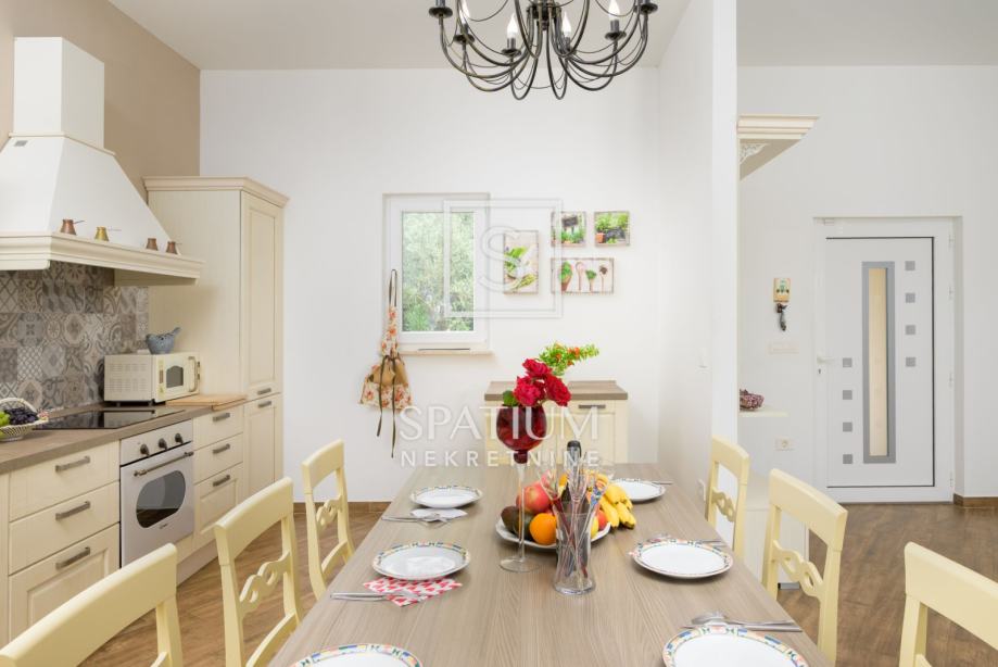 Unutrašnjost se sastoji od lijepo opremljene kuhinje s blagovaonicom i dnevnim boravkom iz kojeg se izlazi na natkrivenu terasu i prostor uz bazen dimenzija 36 m2. Kuća raspolaže s tri spavaće sobe i tri kupaonice – dvije kupaonice opremljene su tušem, dok treća ima kadu.