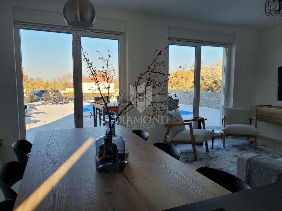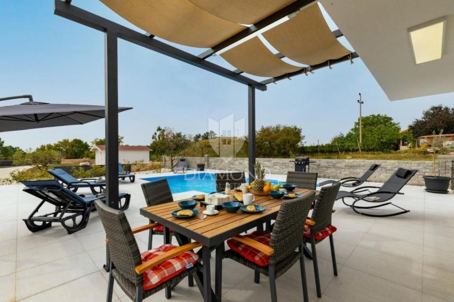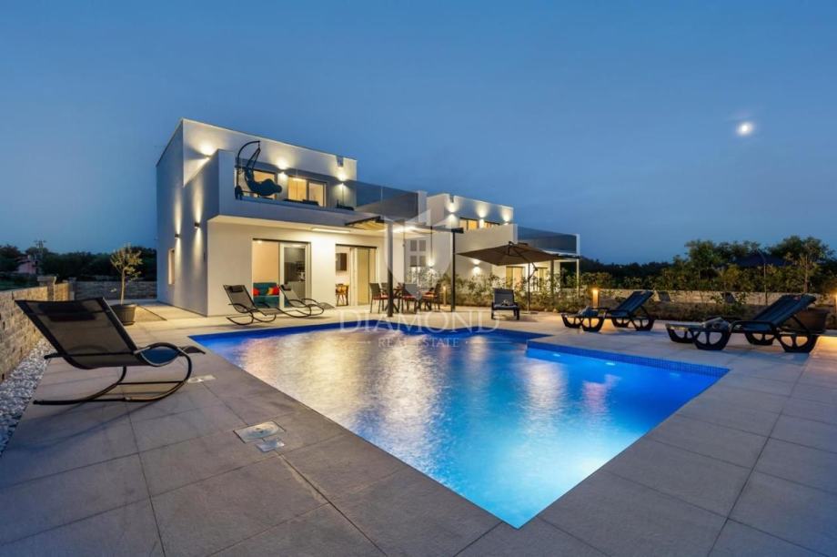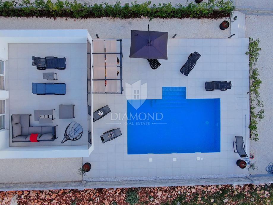 Okućnica se prostire na 1000 m2, uključujući prekrasan grijani bazen kvadrature 40 m2 s fluorescentnim mozaikom koji stvara posebnu atmosferu nakon zalaska Sunca. Maslinik, star 40 godina, omeđen suhozidom, dodatno uljepšava ovo imanje. Za održavanje okućnice provedeno je automatsko navodnjavanje.