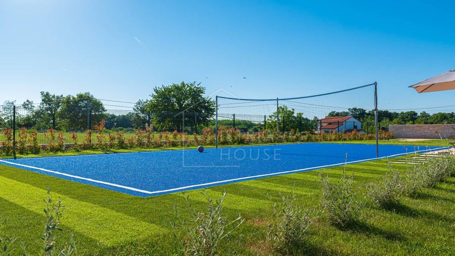 Na vanjskom dijelu okućnice se nalazi bazen sa pripadajućim sunčalištem , ljetna terasa sa roštiljem te sportski sadržaji, odbojkaški teren.