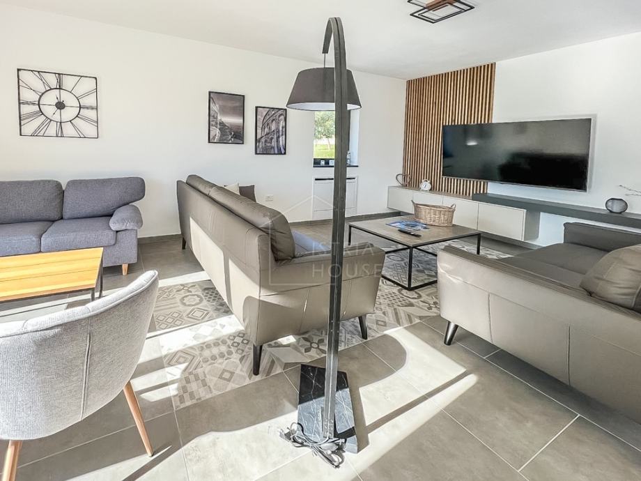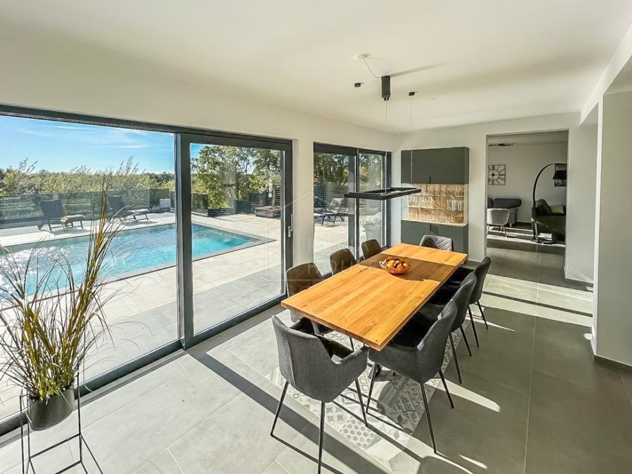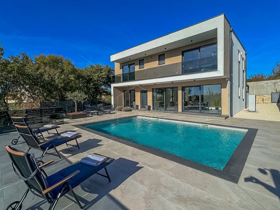 U blizini srednjovjekovnog gradića Svetvinčenta, na rubu mirnog mjesta prodaje se suvremena vila u izgradnji sa bazenom i uređenom okućnicom.