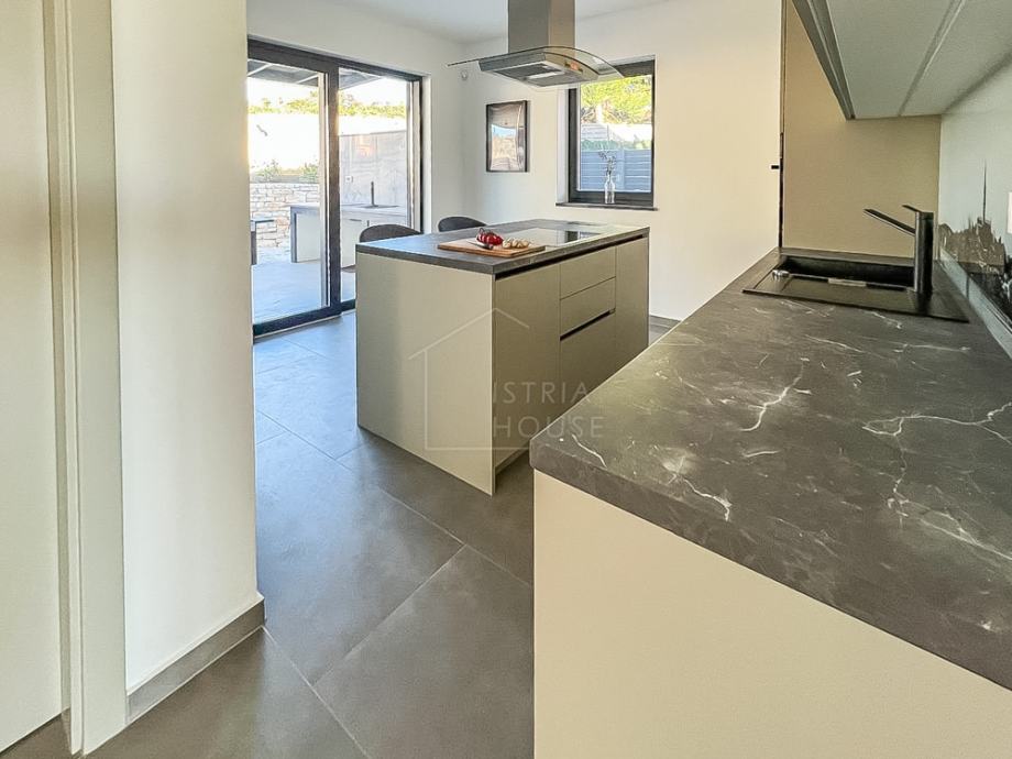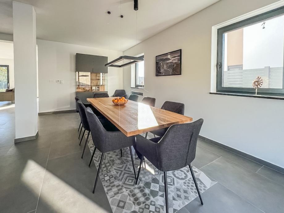 Vila sa svojom površinom od 200m2 se nalazi na okućnici od 640 m2 te se sastoji od prizemlja i prvog kata. U prizemlju pronalazimo kuhinju , blagavaonu, dnevni boravak, wc te spremište ili vešeraj. Iz glavnih prostorija prizemlja pruža se pogled na vanjsku okućnicu preko velikih otvora te time osvjetljuju prostore i daju im potrebnu dnevnu svjetlost.