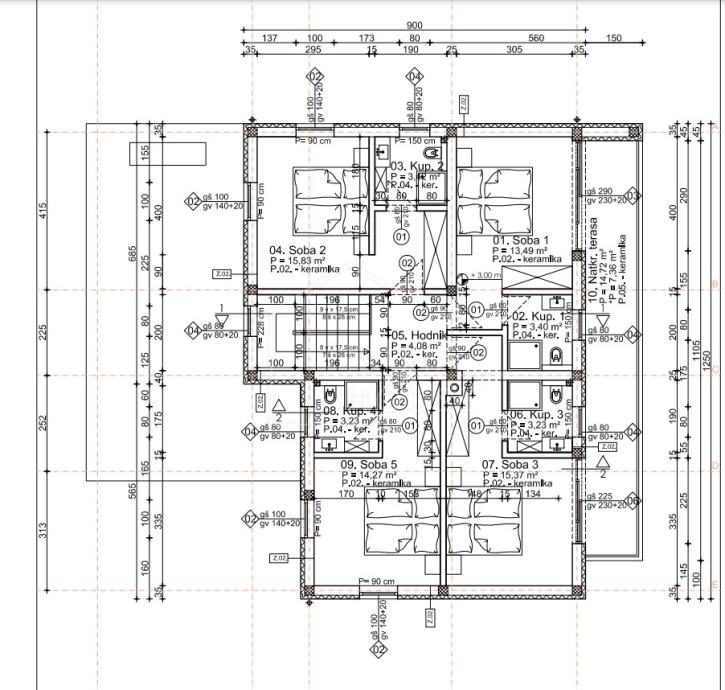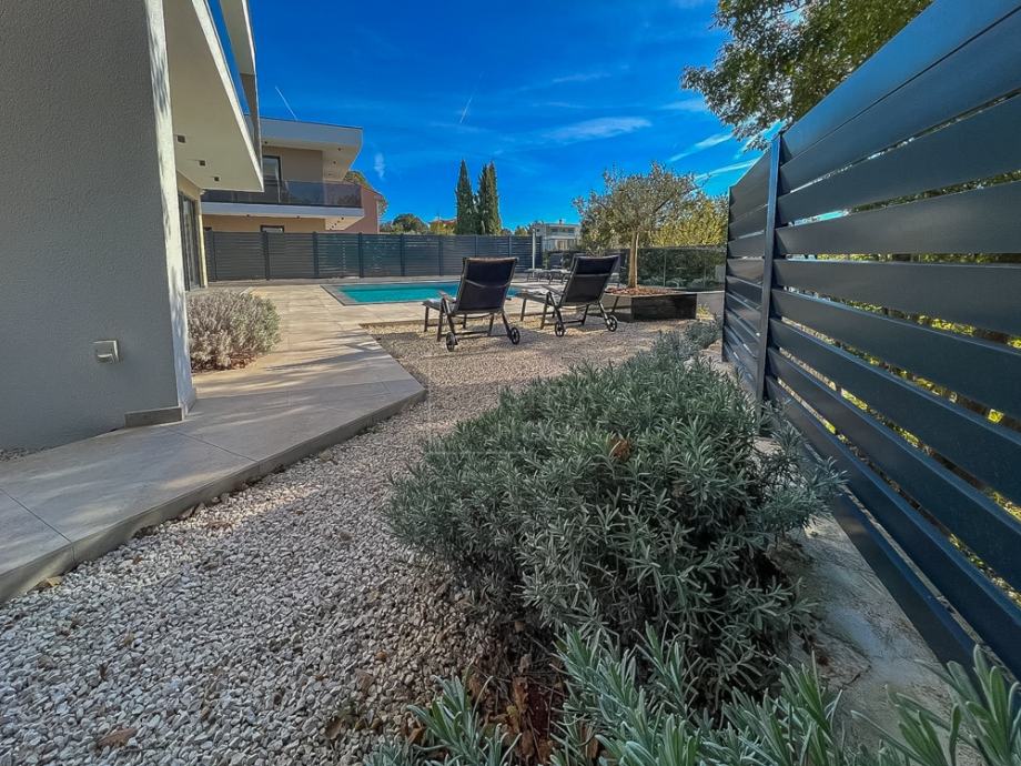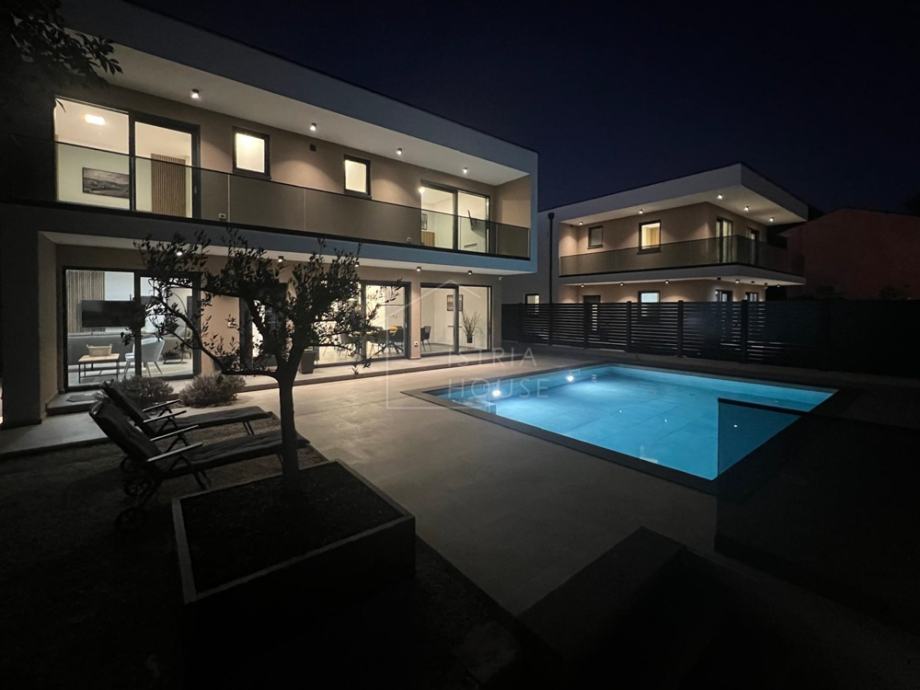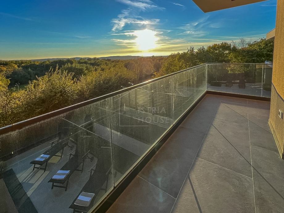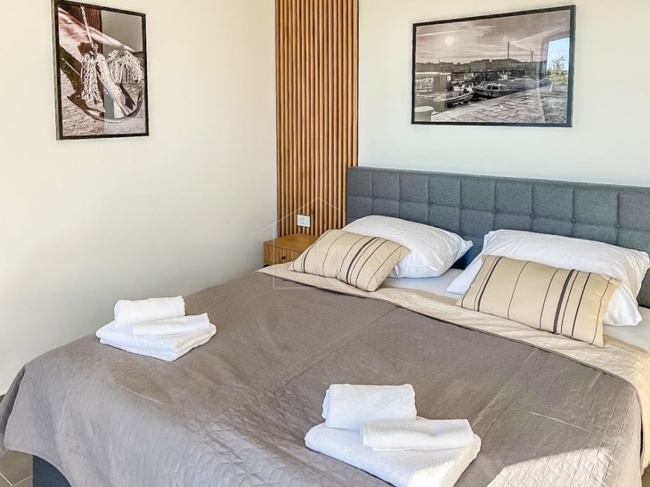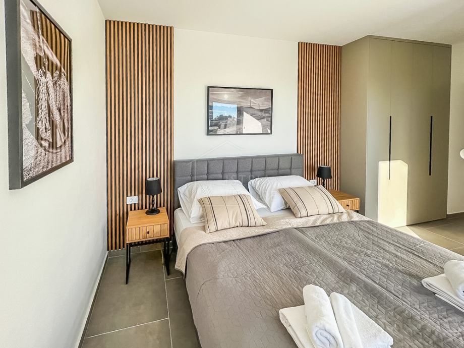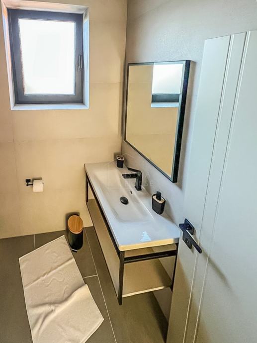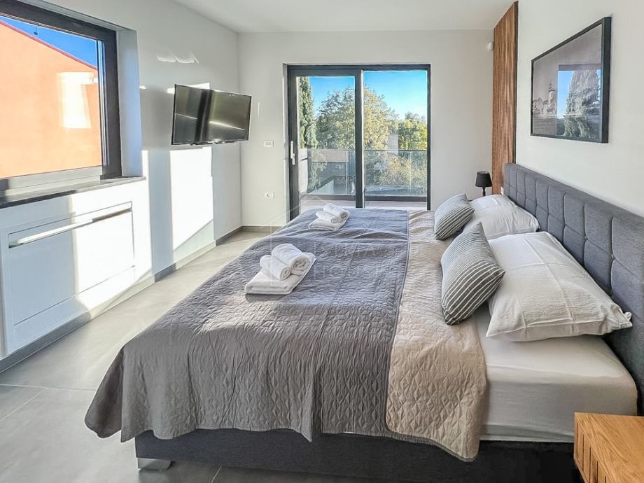 Na prvom katu nalaze se 4 spavaće sobe, svaka sa svojom vlastitom kupaonicom te garderobom, s time da dvije spavaće sobe imaju izlaz na terasu površine 14.72 m2 sa koje se pruža pogled na bazen
