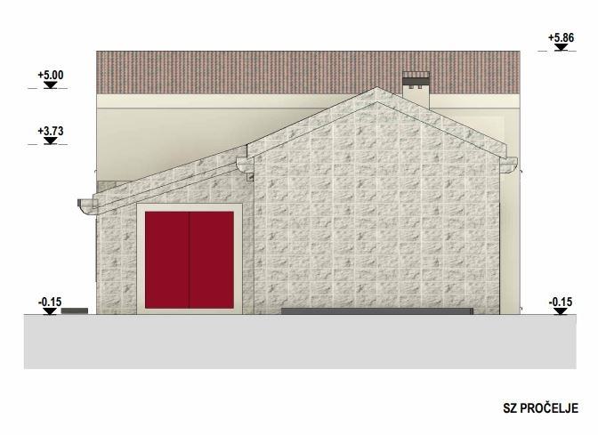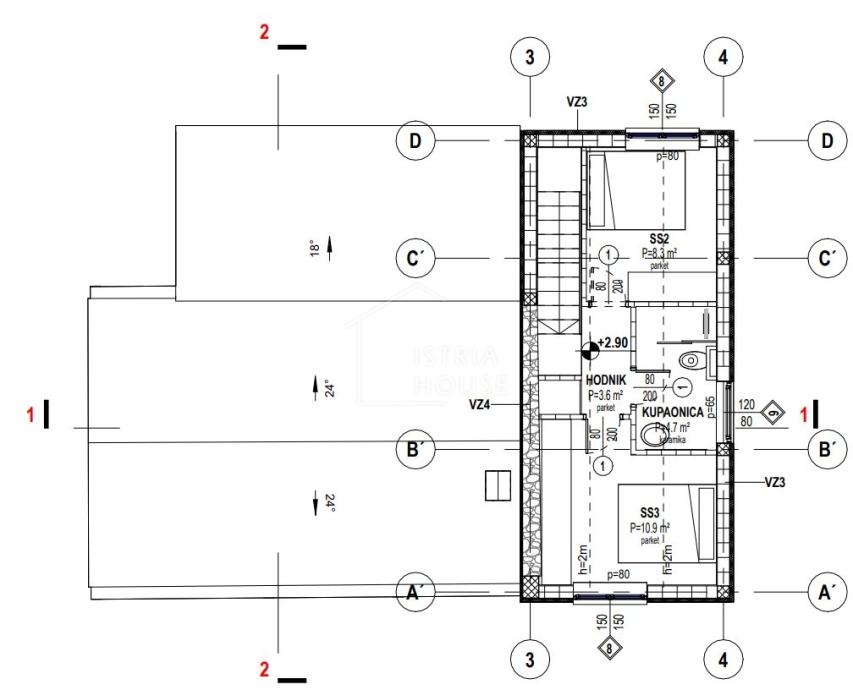 Na kat se dolazi unutarnjim stubištem, a na katu su predviđene 2 spavaće sobe i kupaonica.