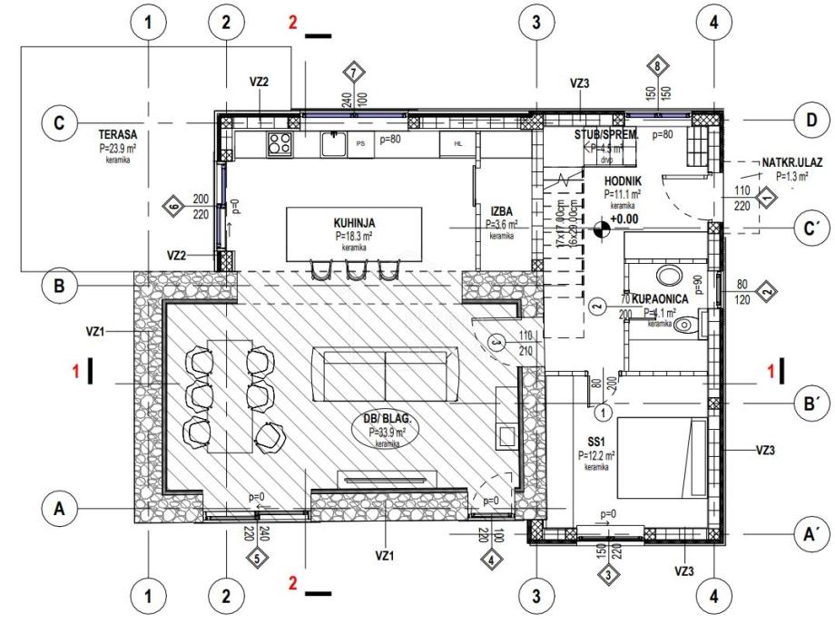 U prizemlju kuće su predviđene sljedeće prostorije: dnevni boravak, blagovaonica (u dnevnom boravku i blagovaonici je visina stropa 5m) i kuhinja kao open space prostor, ostava, kupaonica, hodnik, spavaća soba.