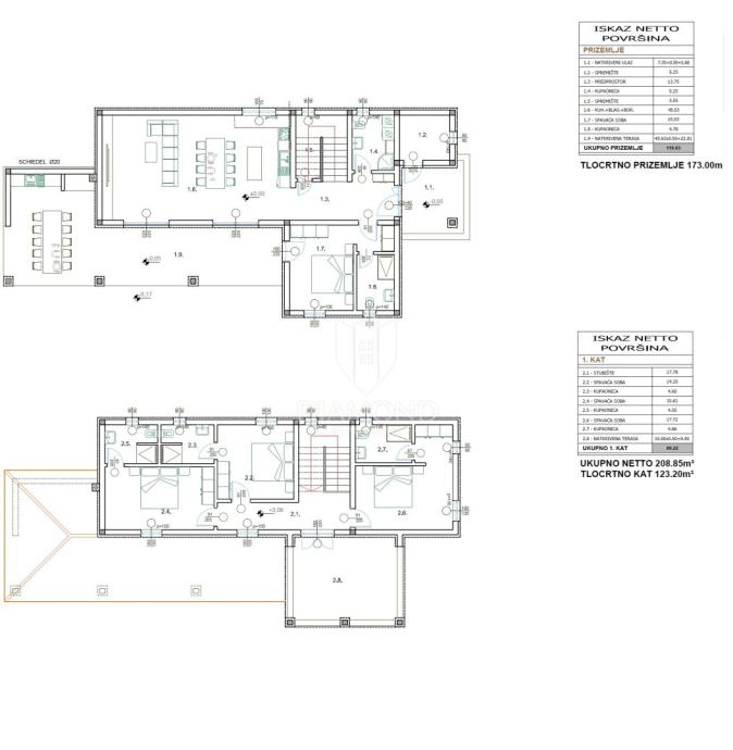Ova nova kuća nalazi se na zemljištu površine od 774m2 koje je ograđeno i čijem se sklopu nalaze tri natkrivena parkirna mjesta. Sama kuća sastoji se od prizemlja i kata ukupne korisne površine od 167m2. U prizemlju dominira open space prostor gdje se nalazi dnevni boravak spojen sa kuhinjom i blagovaonicom iz kojeg se preko velike staklene stijene izlazi na prostranu natkrivenu terasu u čijem se sklopu nalazi ljetna kuhinja. Nastavno na terasu nalazi se i bazen sa sunčalištem. U prizemlju se još nalazi jedna spavaća soba sa kupaonicom, manje spremište, gostinjski wc te spremište koje ima ulaz sa vanjske strane kuće. Na prvom katu kuće nalaze se još dvije spavaće sobe, obje sa vlastitom kupaonicom dok jedna od njih ima i vlastiti walk in ormar.