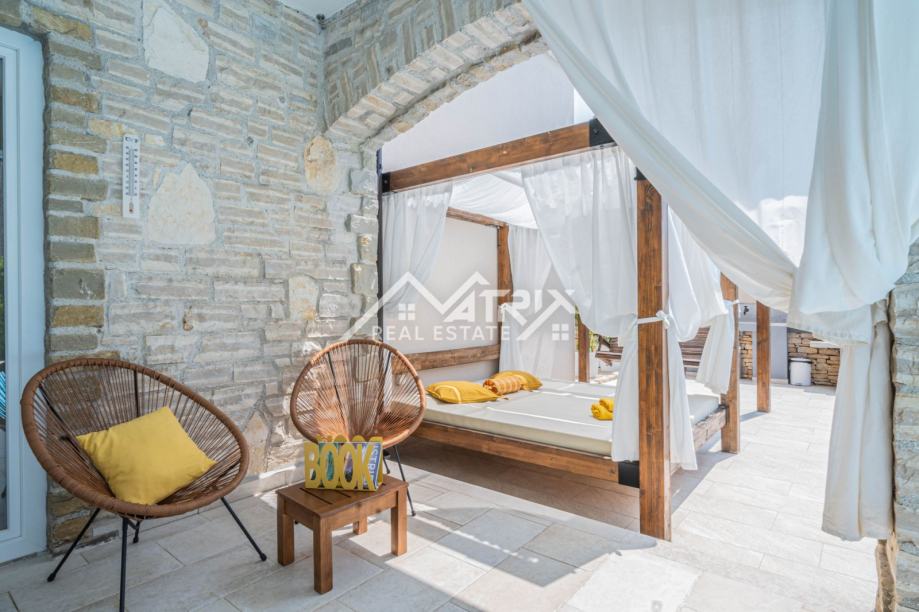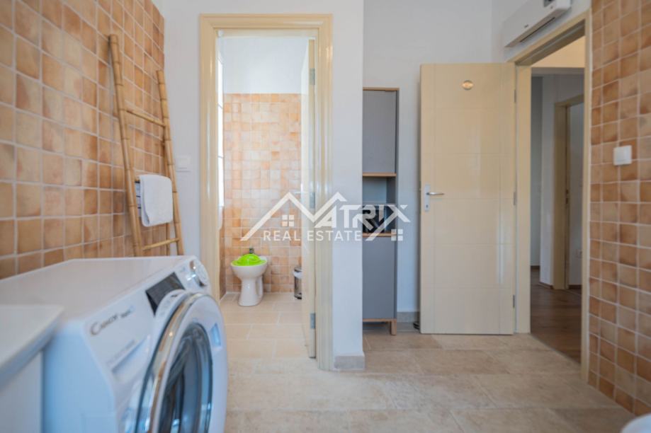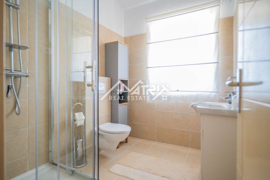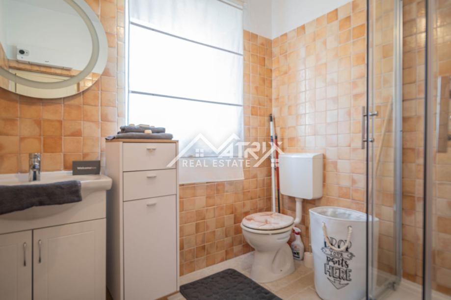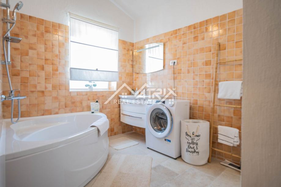 Poseban adut ove nekretnine je bazen od 80 m², podijeljen na dječji dio (30 m², dubina 40 cm) i dio za plivače (50 m², dubina 135 cm), s morskom vodom – savršeno za obitelji s djecom i ljetne užitke. Osim toga, kuća ima dodatnu prostoriju s kupaonicom, idealnu za buduću teretanu ili spa zonu.