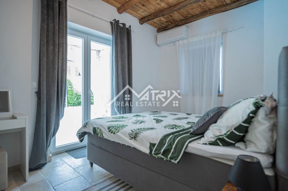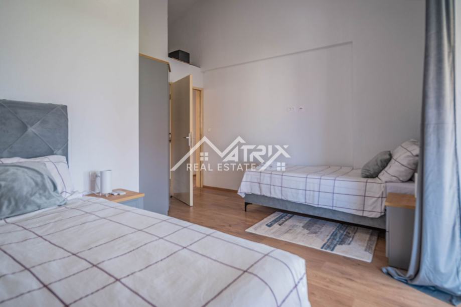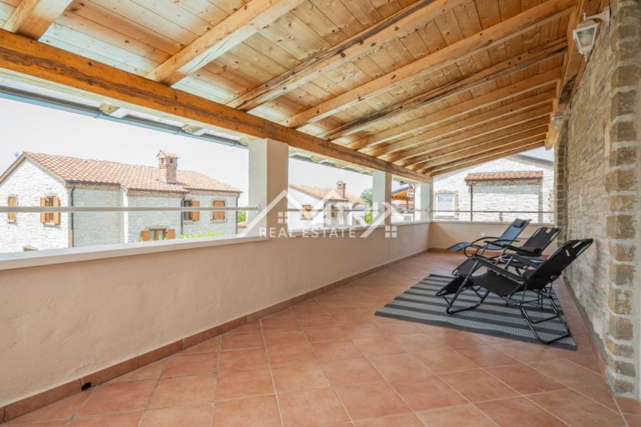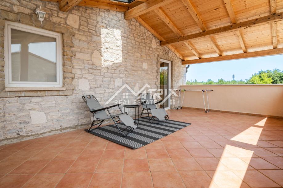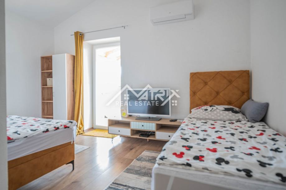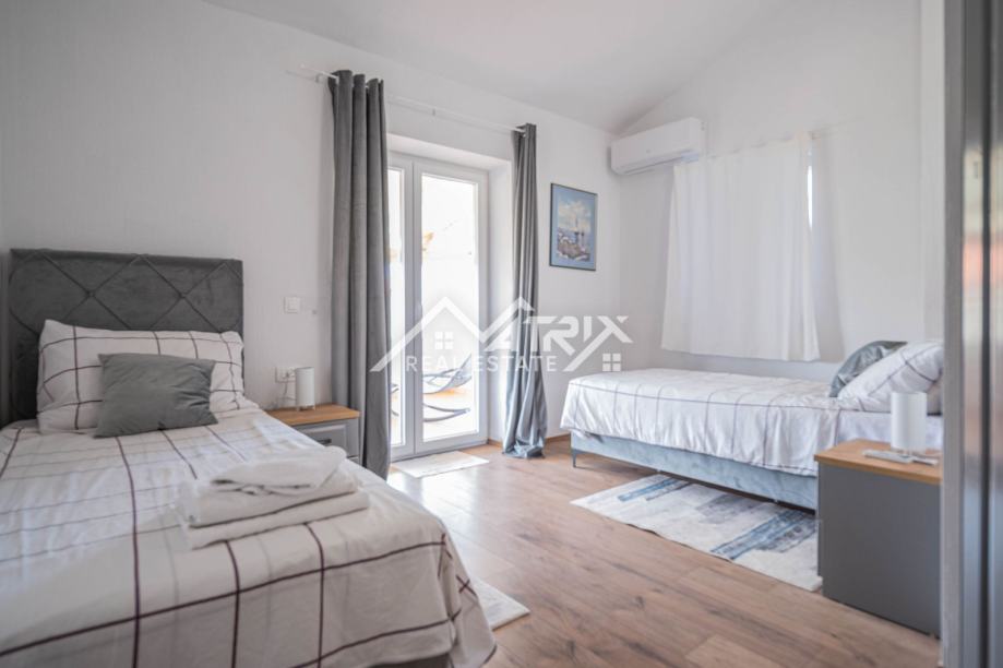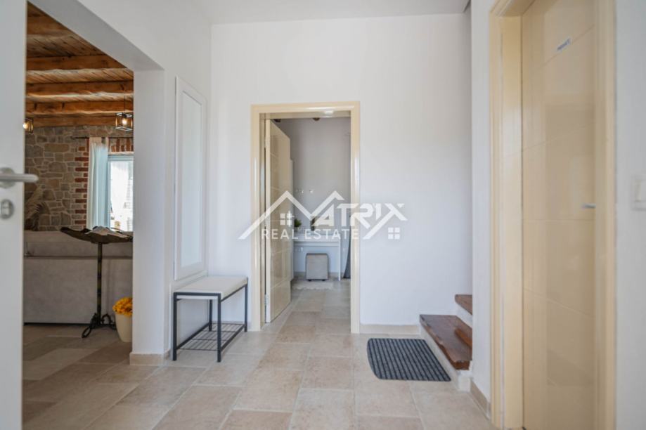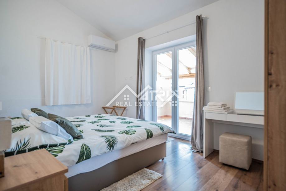 Prizemlje uključuje prostrani dnevni boravak s kuhinjom, jednu spavaću sobu, kupaonicu, ostavu i izlaz na natkrivenu terasu idealnu za opuštanje. Na katu se nalaze tri dodatne spavaće sobe, dvije kupaonice te dvije velike natkrivene terase koje pružaju pogled na uređenu okućnicu i okolno zelenilo. Sve prostorije su klimatizirane.