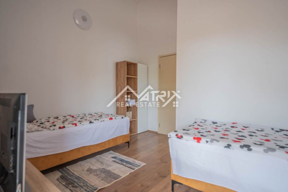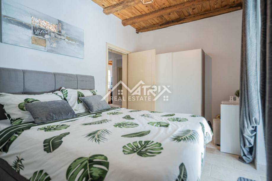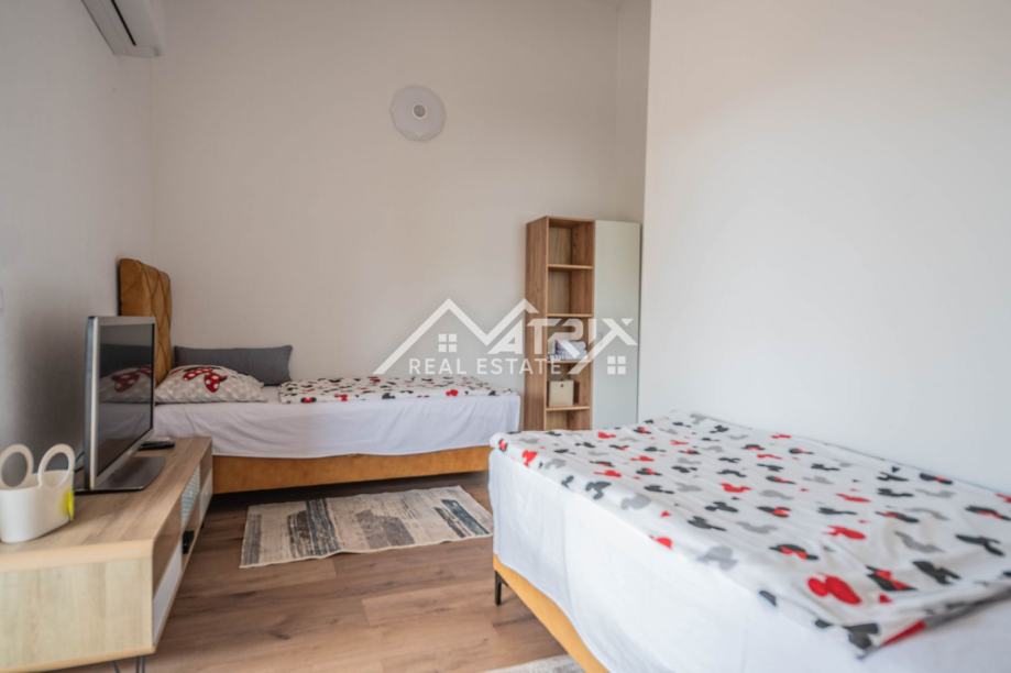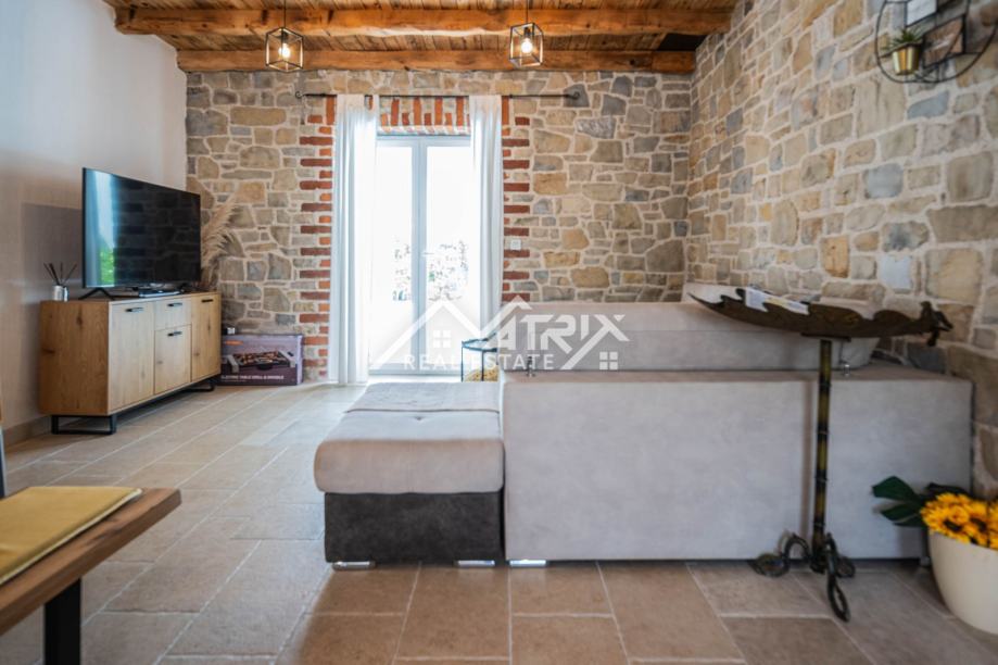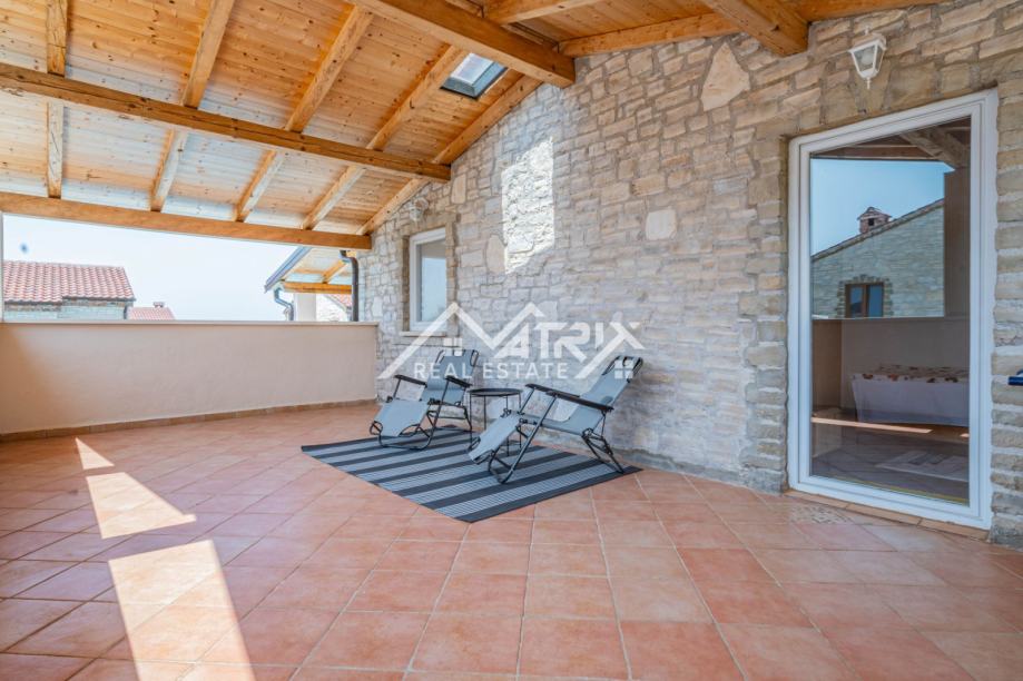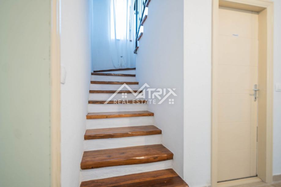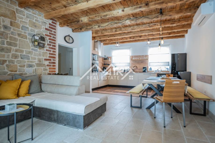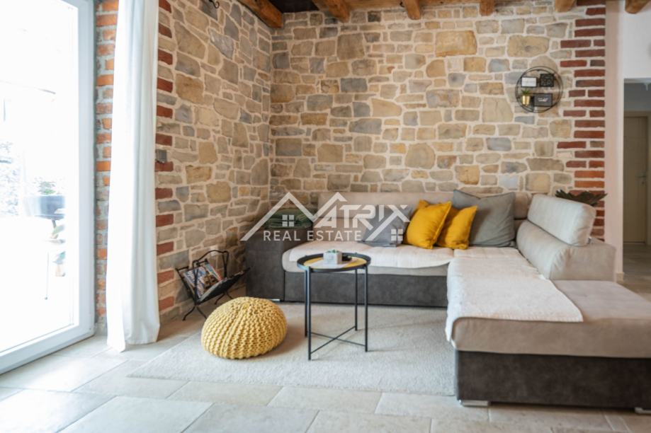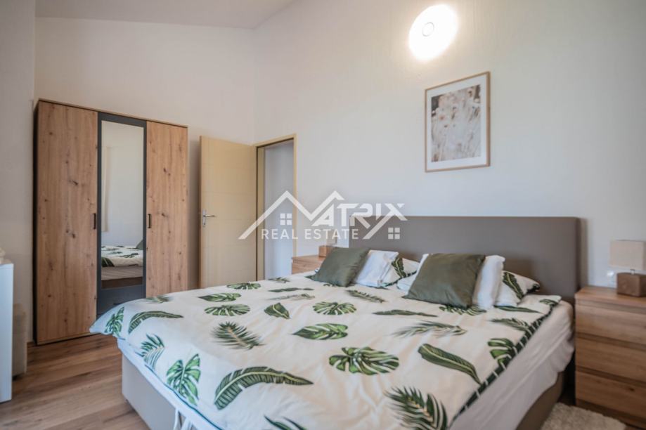 Prizemlje uključuje prostrani dnevni boravak s kuhinjom, jednu spavaću sobu, kupaonicu, ostavu i izlaz na natkrivenu terasu idealnu za opuštanje. Na katu se nalaze tri dodatne spavaće sobe, dvije kupaonice te dvije velike natkrivene terase koje pružaju pogled na uređenu okućnicu i okolno zelenilo. Sve prostorije su klimatizirane.