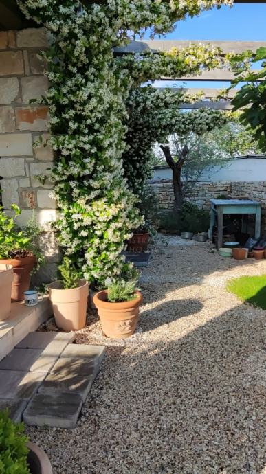 Dodatni vanjski objekt služi kao radna soba s terasom. Uređena okućnica sadrži bazen od 32 m² i sunčalište.