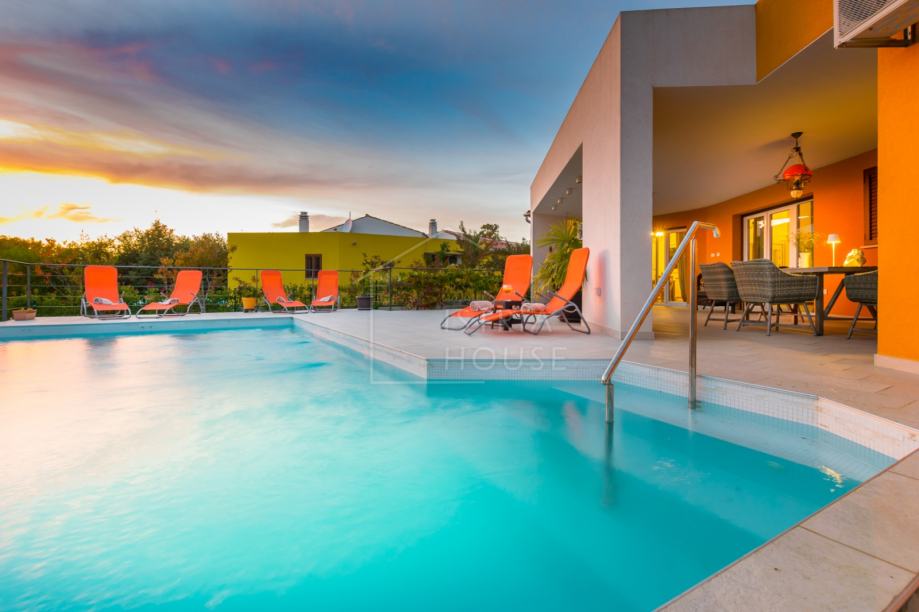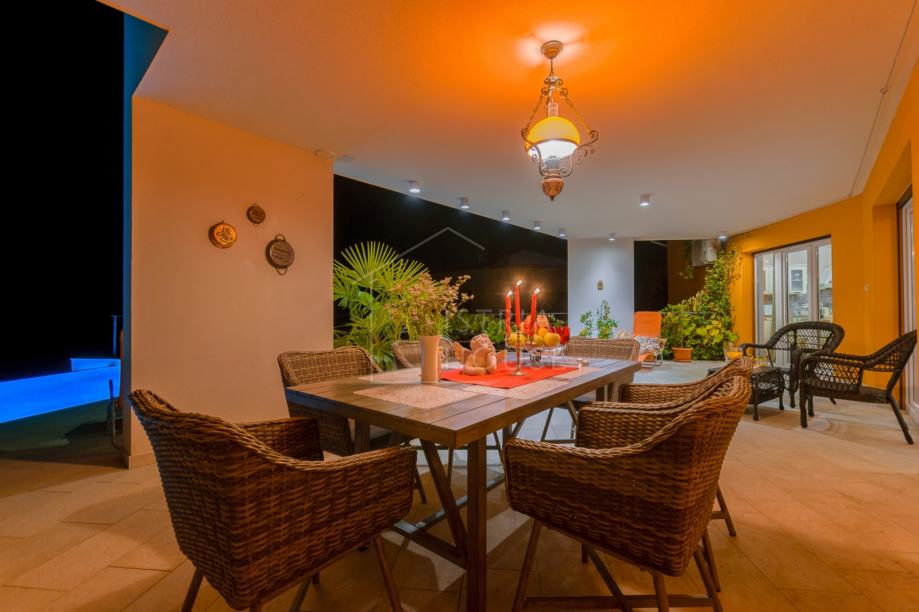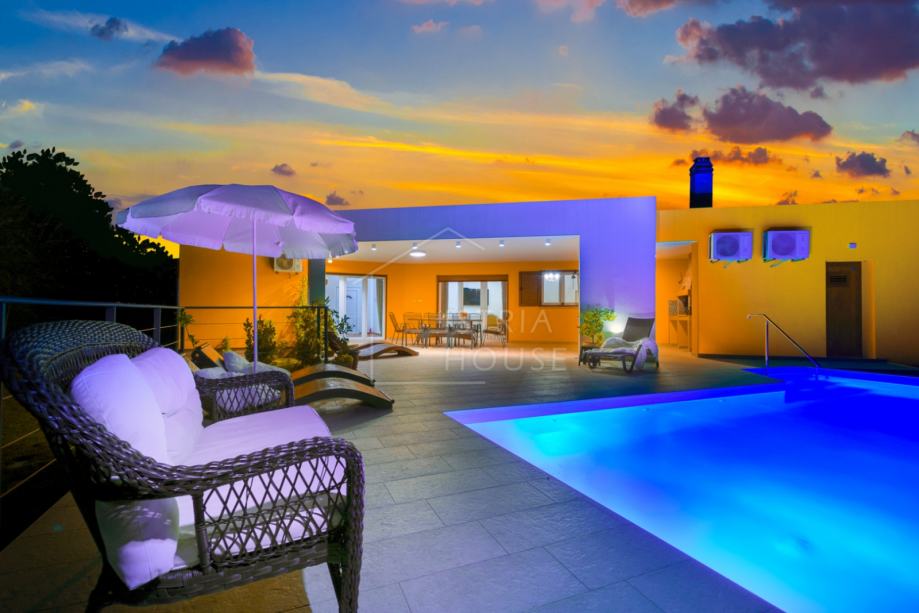 Sastoji se od tri spavaće sobe svaka sa svojom kupaonicom, dnevnog boravka, te kuhinje sa blagavaonom. Vila posjeduje i saunu te je cijela klimatizirana. Iz blagavaone te dnevnog boravka pruža se pogled te ulazi na prostranu vanjsku natkrivenu terasu sa izgrađenim kaminom idealnu za obiteljska druženja ali i za zabave. Uz terasu tu je i veliki bazen sa svojim ležaljkama za odmor i opuštanje.