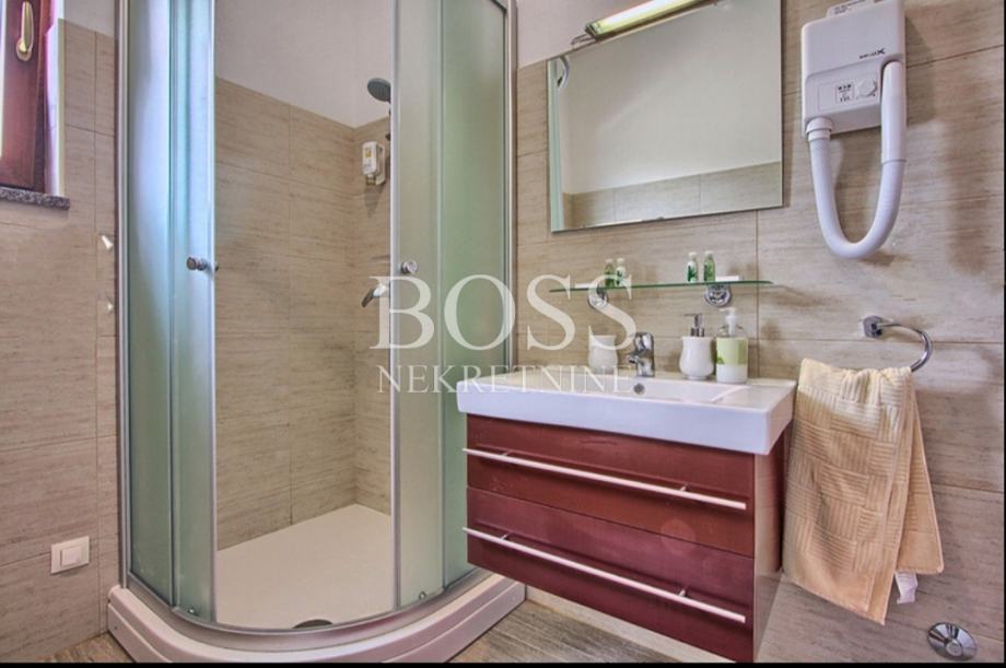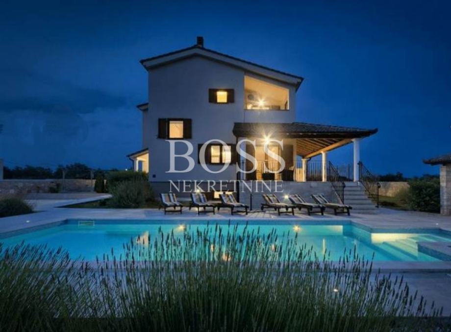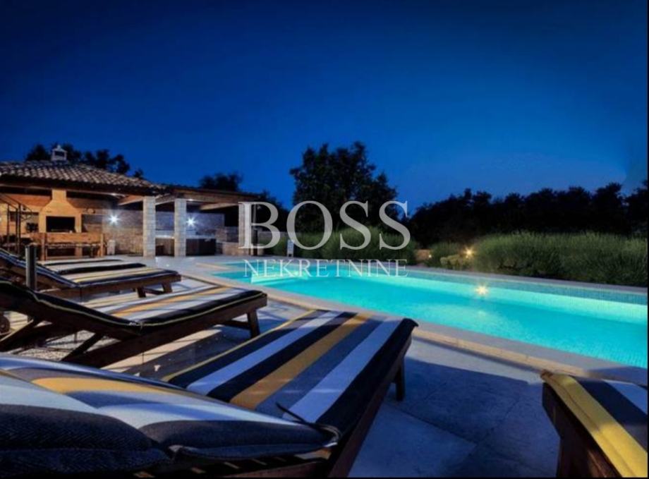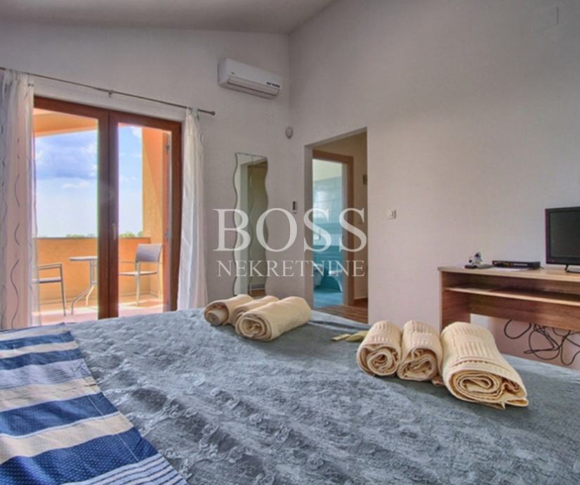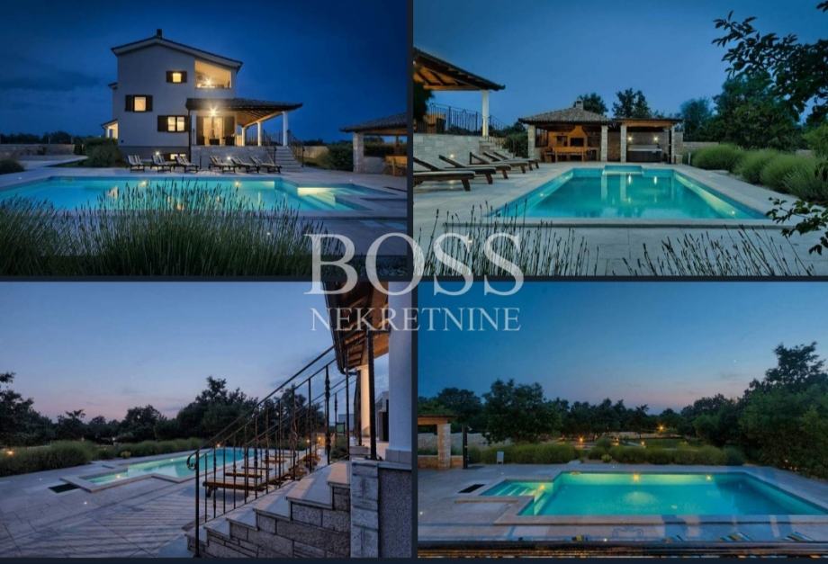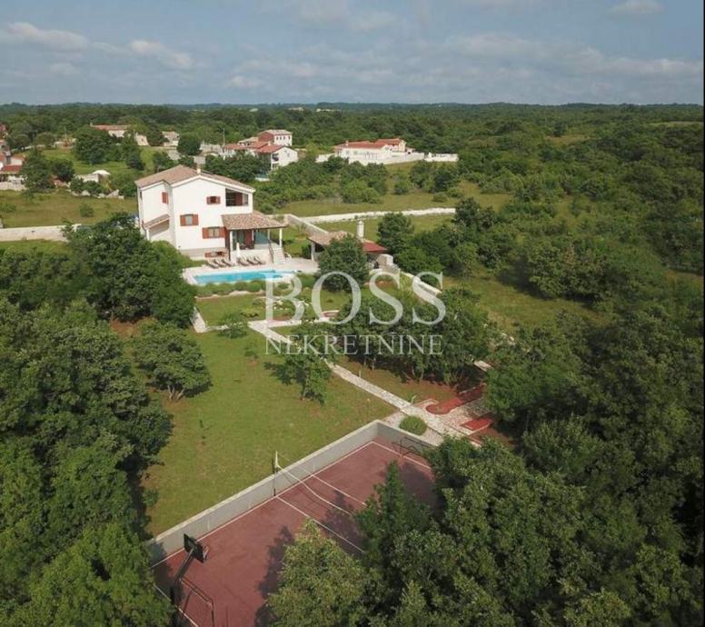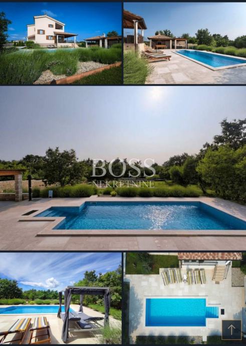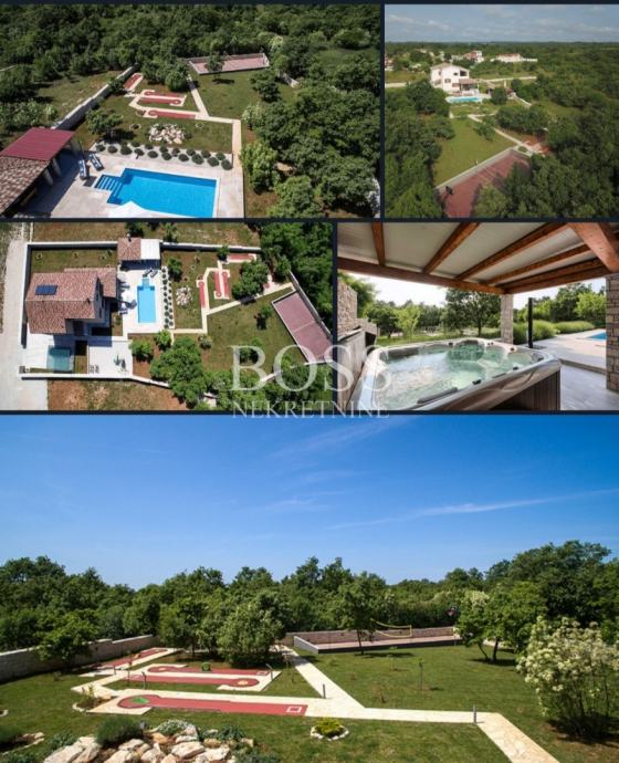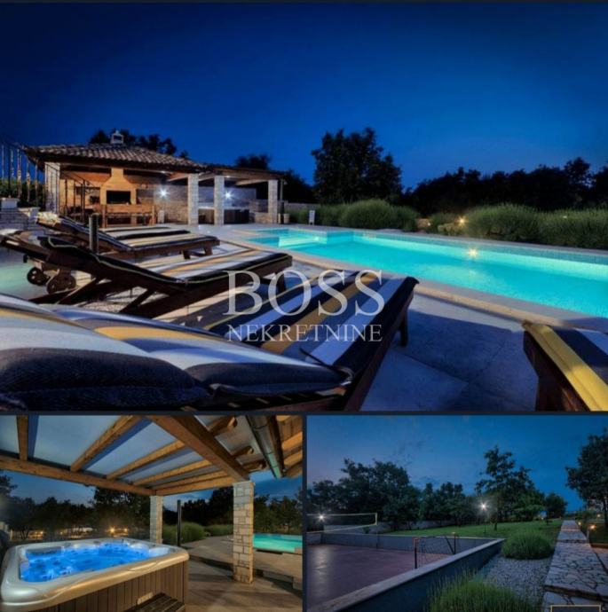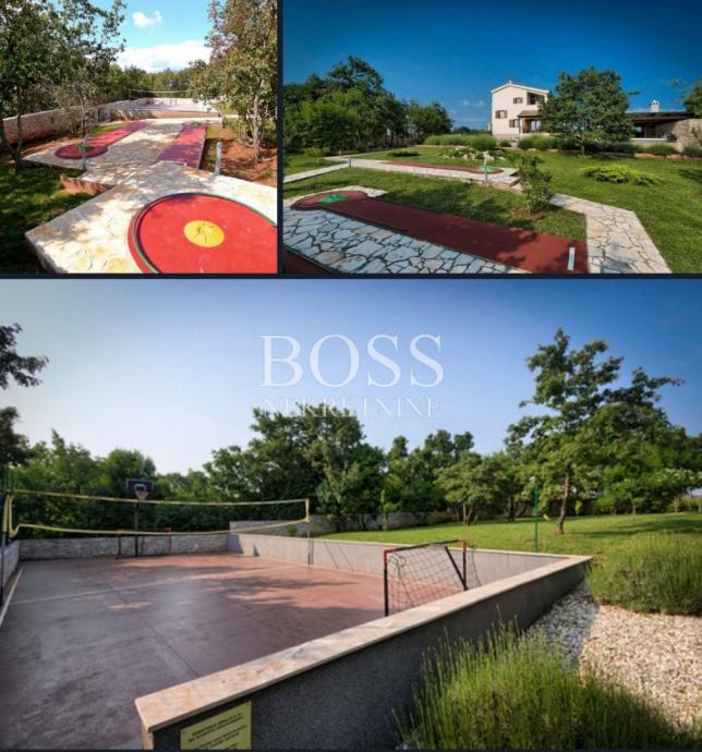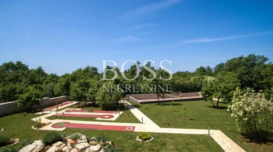 1. kat: spavaća soba 25m2 s bračnim krevetom i pomoćnim ležajem, LED SAT TV, klima uređaj, kupaonica s tušem, umivaonikom, toaletom i bideom. Spavaća soba 25m2 s bračnim krevetom, LED SAT TV, klima uređaj, vlastita kupaonica s tušem, umivaonikom, toaletom i bideom. Spavaća soba 25m2 s bračnim krevetom, LED SAT TV, klima uređaj, vlastita kupaonica s kadom, umivaonikom, WC školjkom i bideom. Sadržaji na otvorenom, kompletno ograđeno, privatni bazen: 36m2, multifunkcionalno igralište (košarka, nogomet, odbojka); 16 x 8 m, mini golf sa šest rupa, dječje igralište, natkriveni prostor za roštilj sa stolom za blagovanje, ležaljke: 8, ležaljka s baldahinom , parking za 3-4 automobila, vanjski tuš. Ova predivna villa nalazi se 27 kilometara od Pule, od Rovinja 24 i Poreča 40 km. Boss, kontakt: 091/782-2323 Tihomir