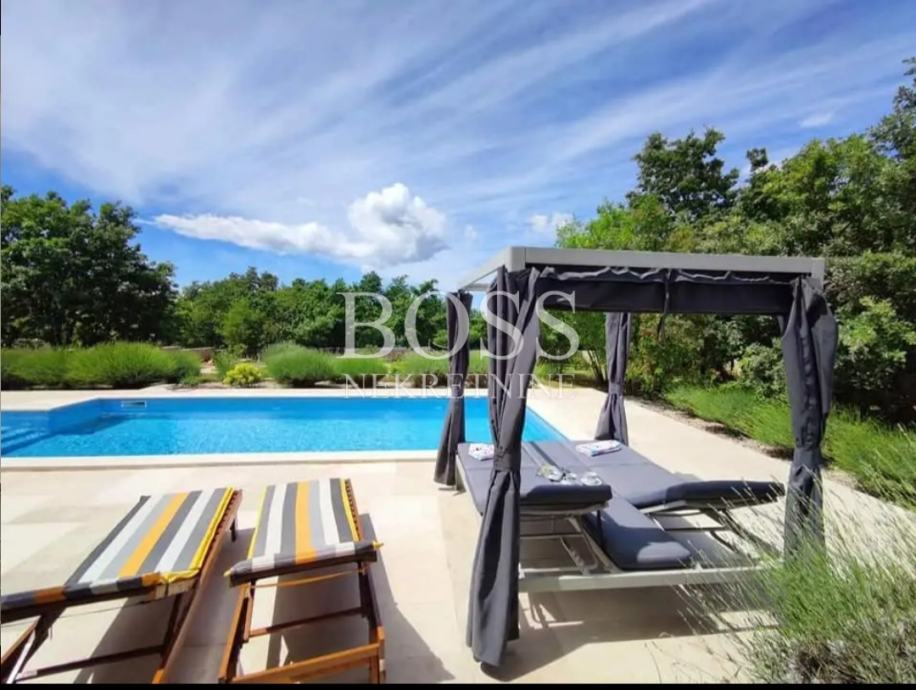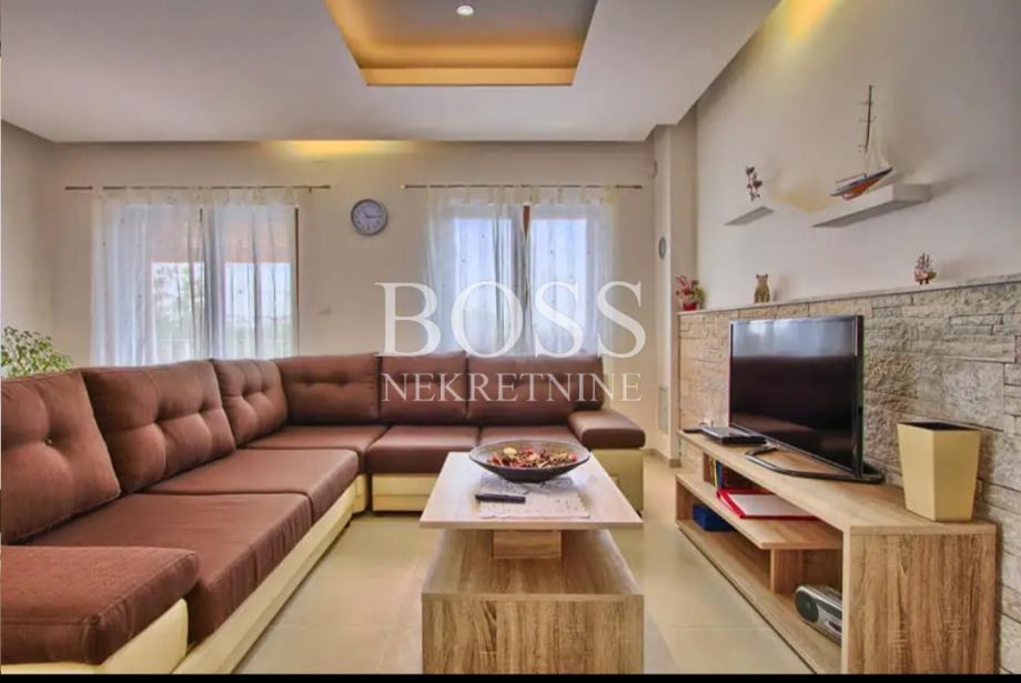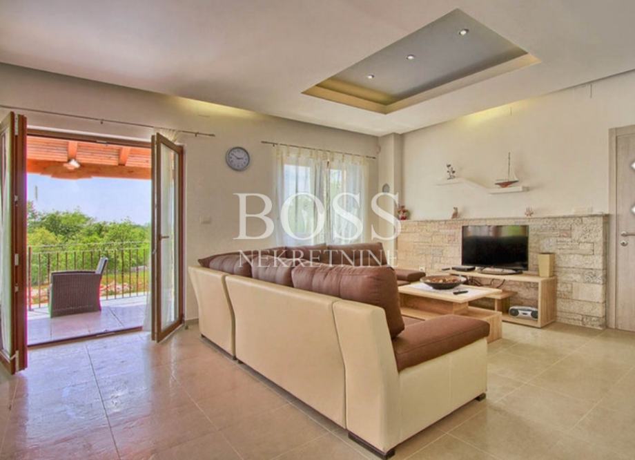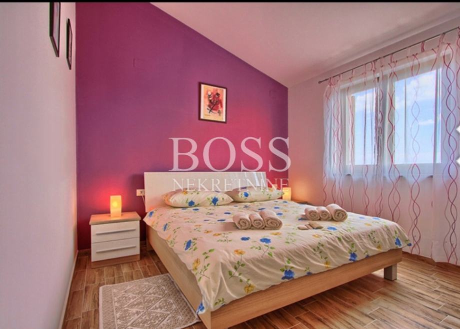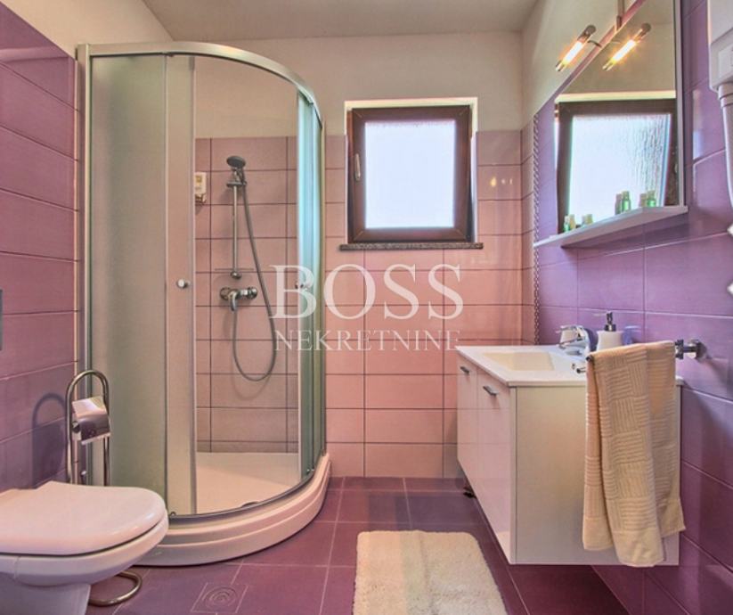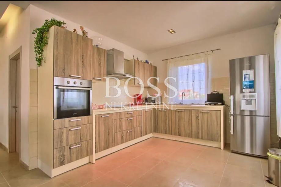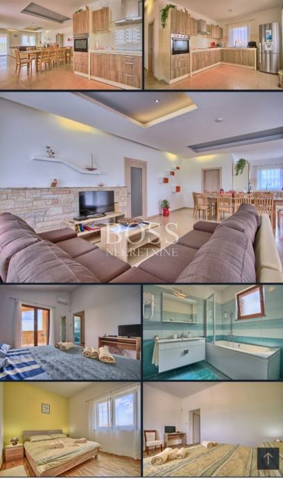 Prizemlje: dnevni boravak s prostorom za sjedenje i LED SAT/TV, PlayStation 4, klima uređaj, blagovaonica (10 sjedećih mjesta). Potpuno opremljena kuhinja (hladnjak sa zamrzivačem, toster, aparat za kavu, mikrovalna pećnica, perilica suđa, roštilj). Spavaća soba 25m2 s bračnim krevetom i krevetom za jednu osobu, LED SAT TV, klima uređaj, vlastita kupaonica s tušem, umivaonikom, WC-om i bideom. Izlaz na terasu (30m2, vrtni namještaj; 1 stol, 10 stolica). Dodatna kupaona s tušem, umivaonikom i toaletom.