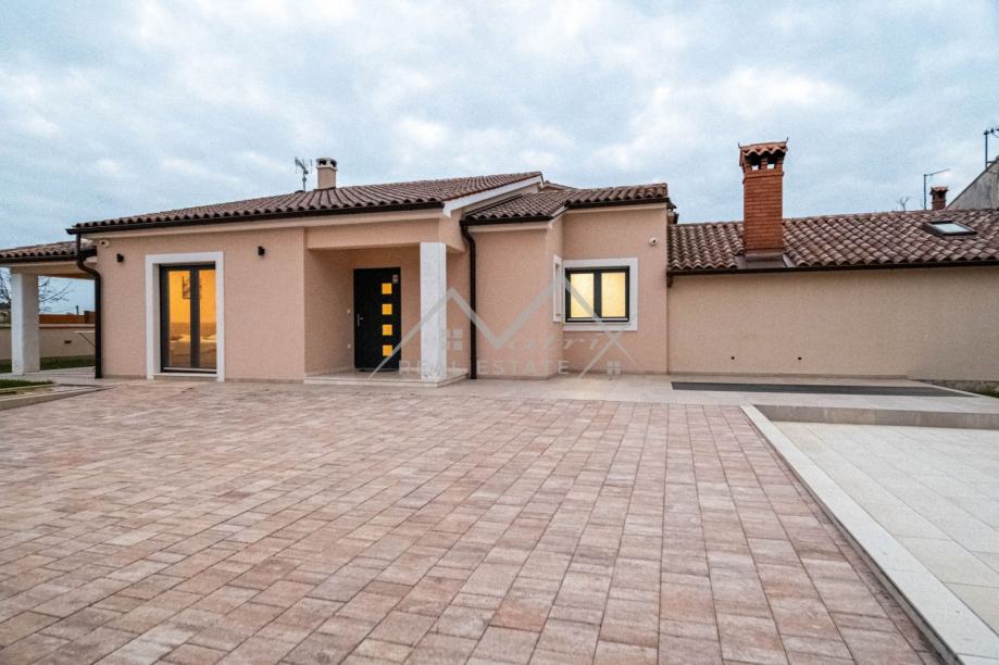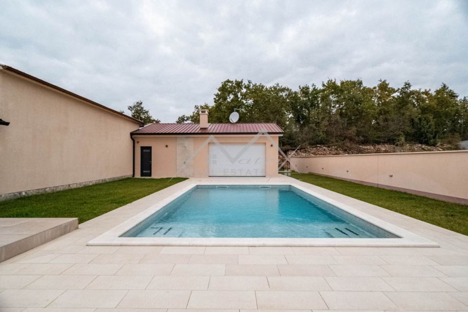 Ova atraktivna prizemnica s bazenom smještena je u mirnom naselju unutar općine Svetvinčenat. Kuća ukupne površine od 135 m2 sastoji se od tri prostrane spavaće sobe, od kojih dvije imaju privatnu kupaonicu, što osigurava visoki nivo udobnosti i privatnosti. Osim toga, tu je odvojeni WC, prostrani dnevni boravak s modernim kaminom na drva te kuhinja s blagovaonicom.