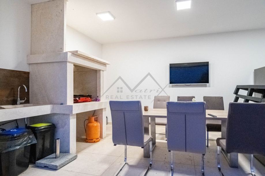 Iz dnevnog boravka izlazi se na natkrivenu terasu koja nudi savršeno mjesto za opuštanje tijekom toplih ljetnih večeri, dok se pored bazena nalazi ljetna kuhinja s prostorom za blagovanje i kaminom te vlastitim toaletom i vanjskim tušem. Uz ljetnu kuhinju smještena je tehnička prostorija koja sadrži svu potrebnu opremu za održavanje bazena, čime je ovo imanje potpuno opremljeno za udoban život.