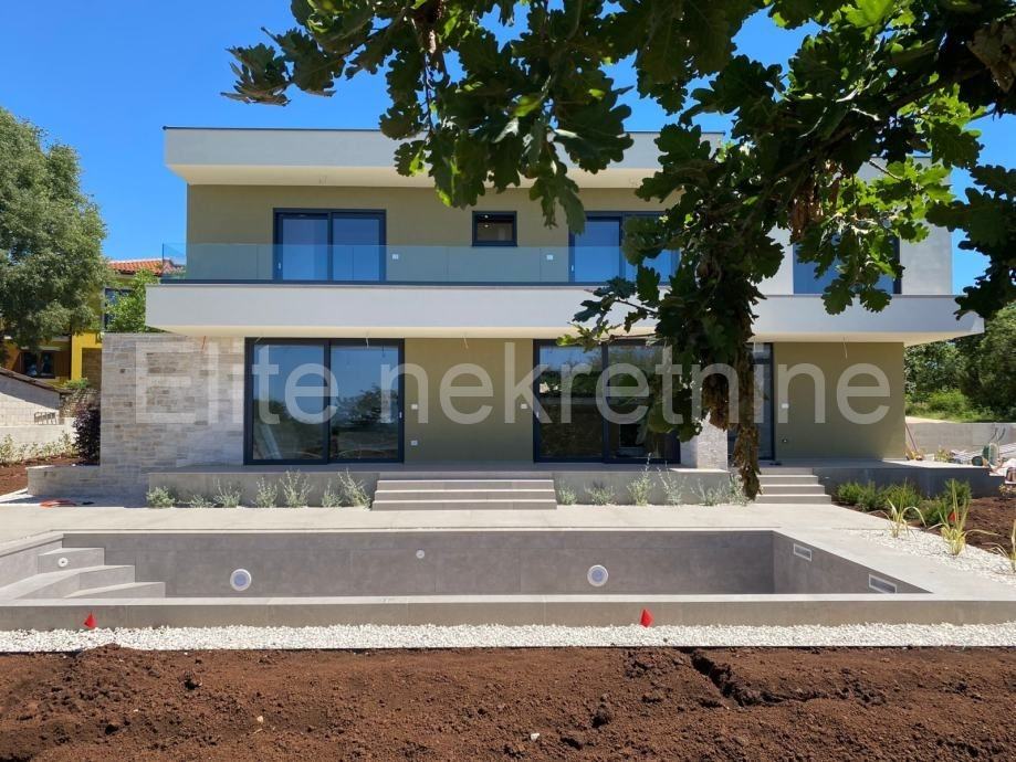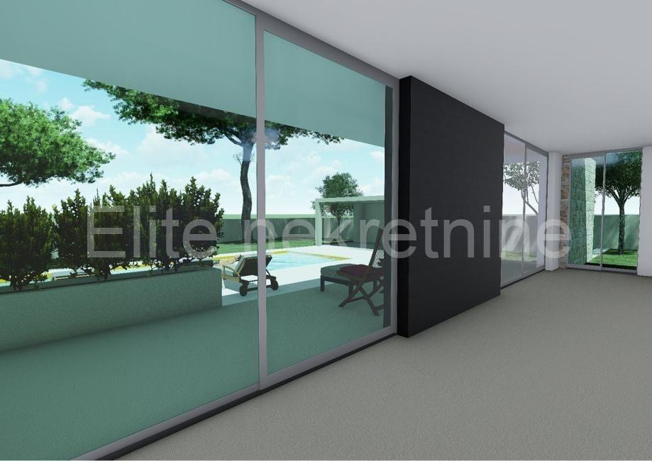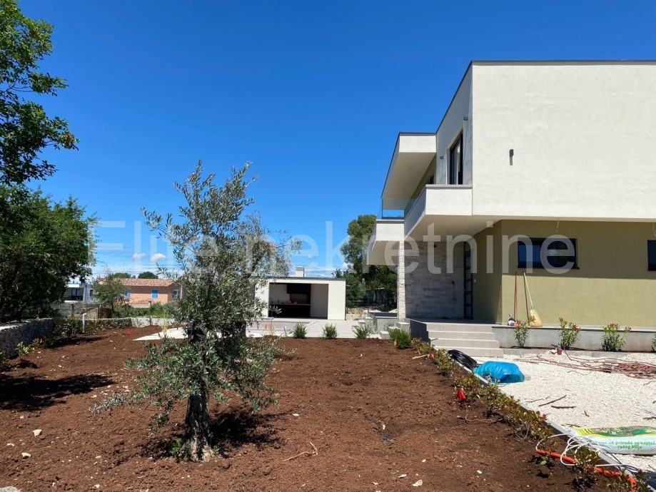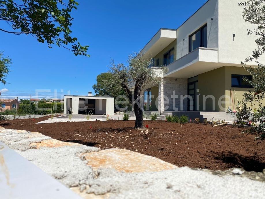 Okućnicu moderne kuće krasi bazen 40 četvornih metara s sunčalištem i ljetnom kuhinjom, zelena površina s automatskim navodnjavanjem, parkiralište za tri automobila i automatska vrata na otvaranje, cijela okućnica ograđena je zidom