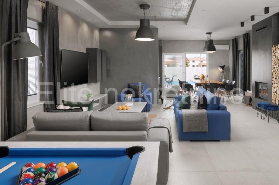 Sastoji se od prizemlja i 1.kata.U prizemlju se nalazi kupatilo, kuhinja, dnevni boravak s blagavaonom koji ima izlaz na vanjsku terasu i dvorište gdje se smjestio bazen veličine 34m2.Na katu se nalaze 3 spavaće sobe sa kupatilima i izlaskom na terasu gdje se pruža predivan pogled na prirodu.