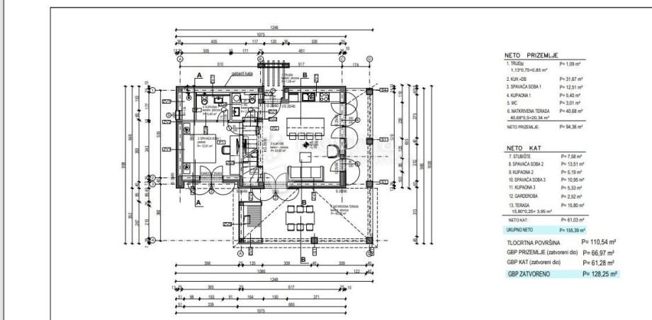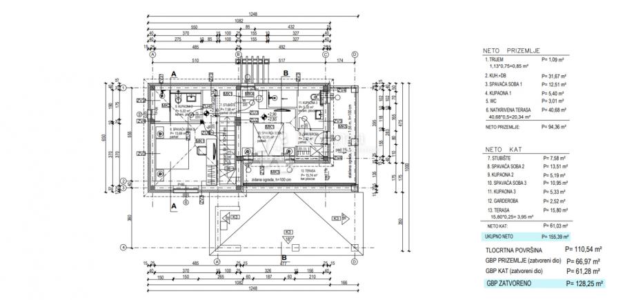 Prizemlje vile obuhvaća kuhinju s dnevnim boravkom, kupaonicu, jednu sobu te natkrivenu terasu površine 15,80 m2.