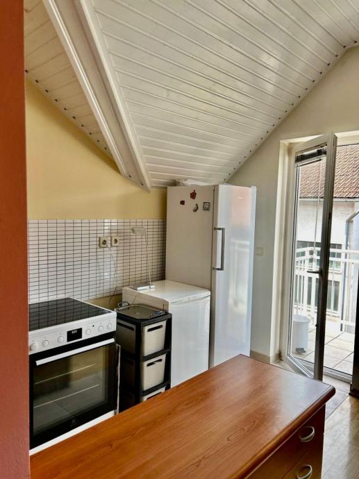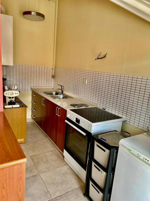Stan se nalazi na drugom katu uredne zgrade bez lifta i odlikuje se vrlo dobrim rasporedom koji maksimalno iskorištava svaki kvadrat. Ulazni hodnik s ugradbenim ormarom vodi prema otvorenom dnevnom prostoru u kojem su boravak, kuhinja i blagovaonica povezani u skladnu cjelinu. Prostor je svijetao i prozračan, a visina stropa do 3,60 m daje dodatni osjećaj komfora i volumena. Iz dnevnog dijela izlazi se na balkon, idealan za jutarnju kavu ili opuštanje na kraju dana.
