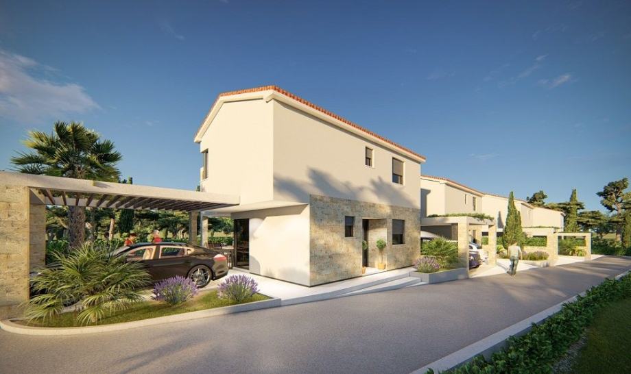 Tar - 4 kuće u nizu sa bazenom novogradnja prodaju se . Kuće imaju 113 m2 stambenog prostora na parcelama od 303 m2-535 m2. Svaka se kuća sastoji u prizemlju od hodnika, kuhinje sa blagovaonom, dnevnog boravka, Wc-a , spremišta i terase , dok se na katu nalaze 3 spavaće sobe, dvije kupaone i terasa.U vrtu se nalazi bazen od 32 m2