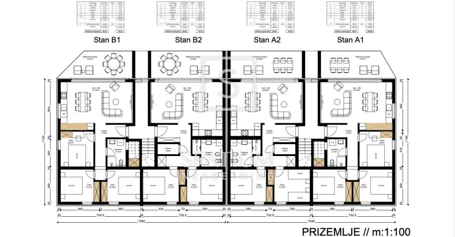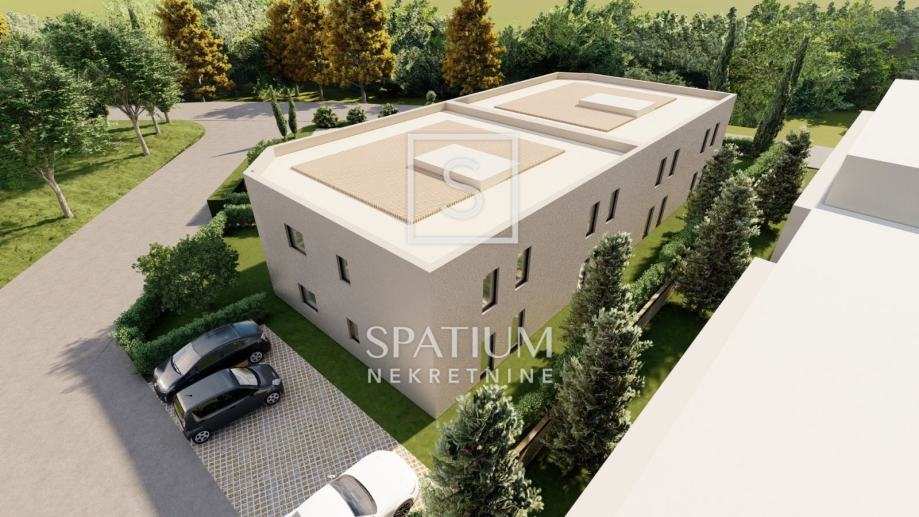 Stan se nalazi u prizemlju visokokvalitetne novogradnje sa ukupno osam stanova (A1). Sastoji se od tri sobe, kupaonice, hodnika, dnevnog boravka s kuhinjom i blagovaonicom te natkrivene terase 15,57 m2. Stanu pripadaju i dva parkirna mjesta.