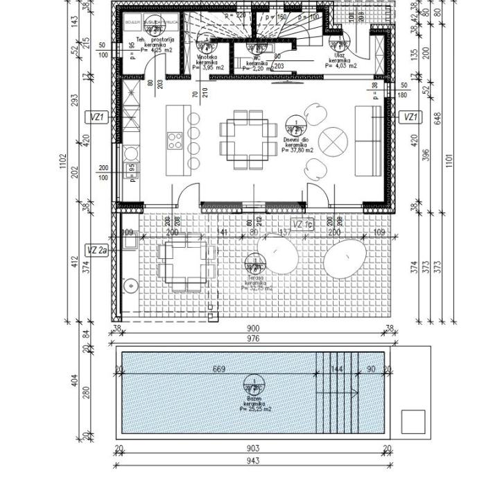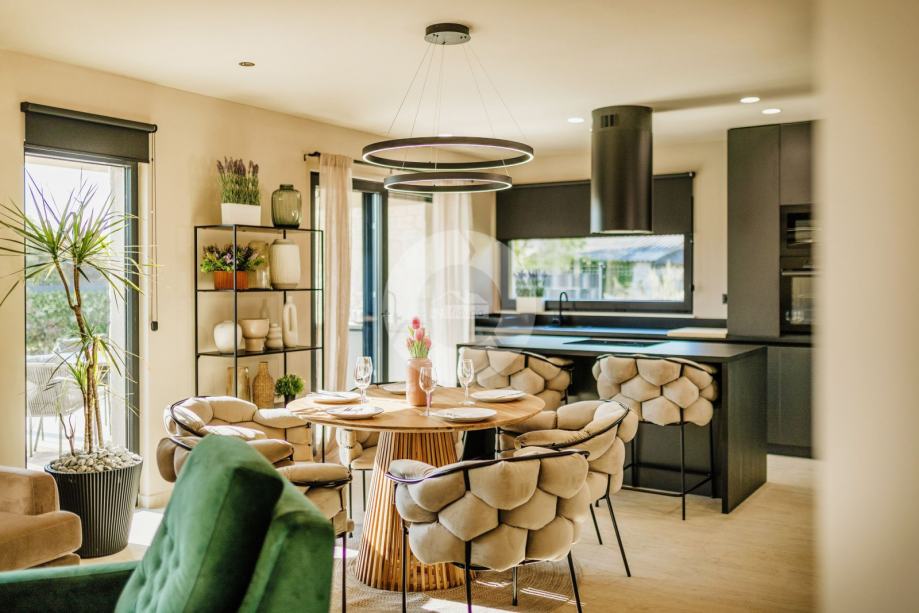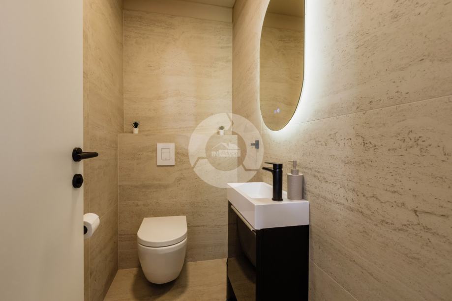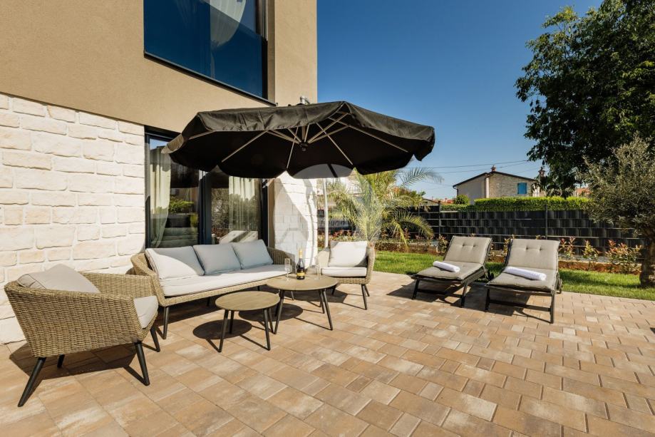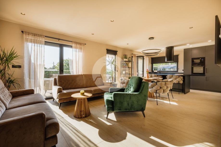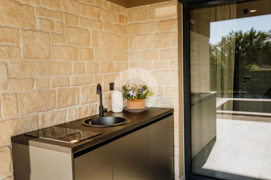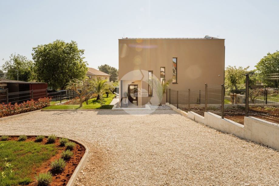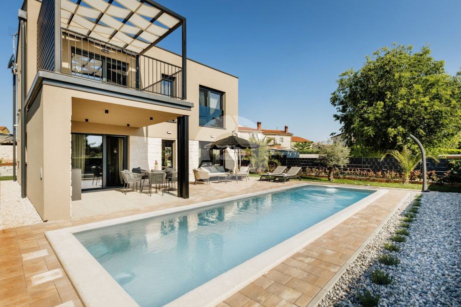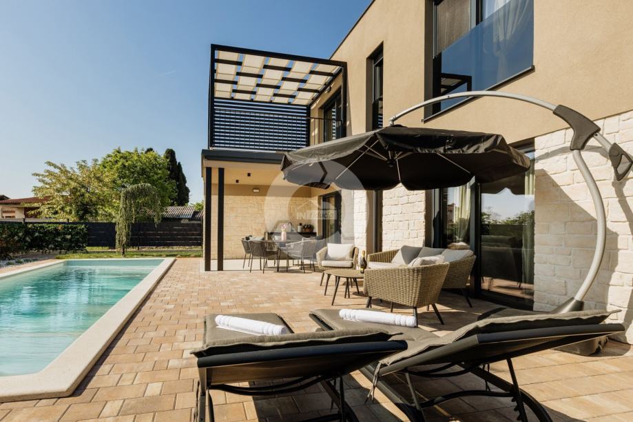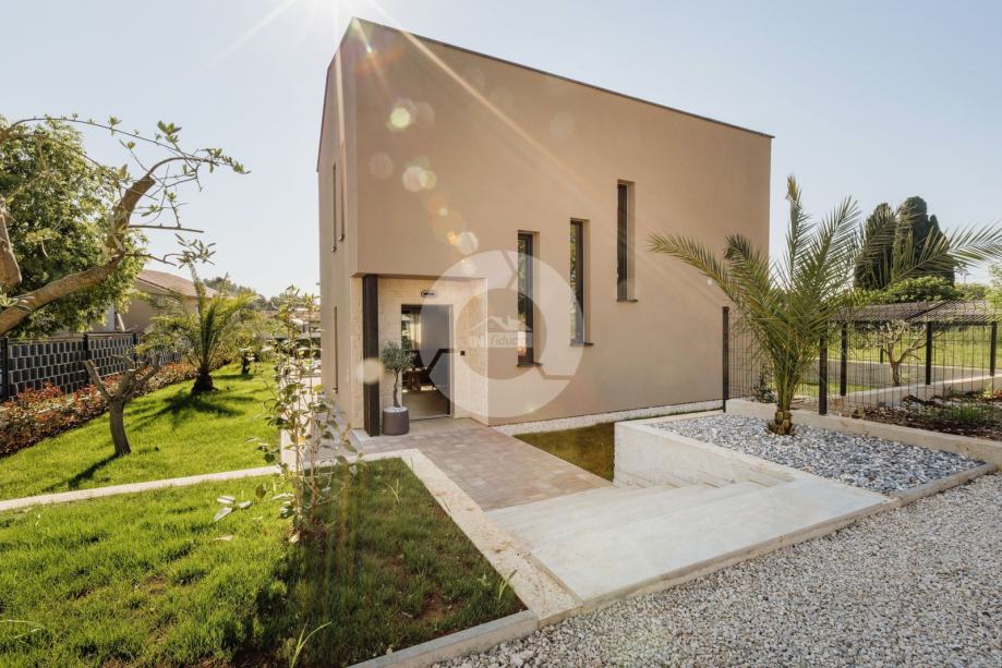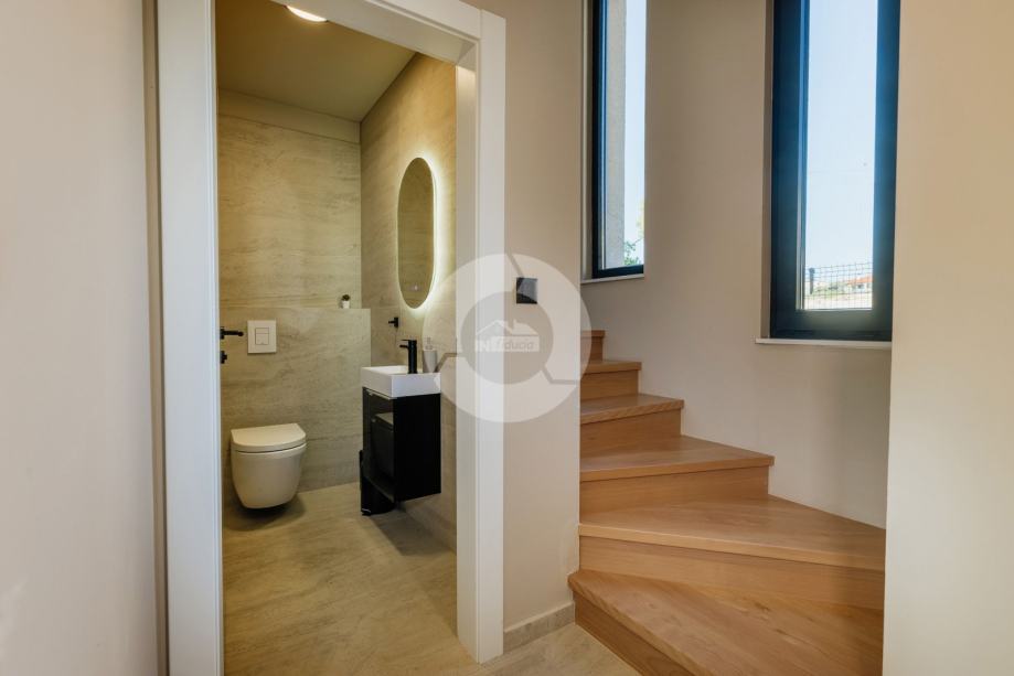 Samostojeća kuća prodaje se u centru istarskog gradića nedaleko od Poreča!!! Modernog je dizajna i prodaje se kompletno opremljena namještajem kao što je prikazano na slikama. Ukupno sa terasama i bazenom ima 170 m2, na zemljištu od 540 m2. Predviđeni dovršetak gradnje je ljeto 2024. godine. Sastoji se od prizemlja i kata. U prizemlju se nalazi ulazni hodnik, dnevni prostor sa izlaskom na prostranu terasu od 32,75 m2, wc, vinoteka i tehnička prostorija. Na katu se nalaze tri spavaće sobe sa dvije kupaone (jedna spavaće soba ima vlastitu kupaonu i natkrivenu terasu). u vrtu je predviđen bazen, travnjak sa mediteranskim biljem te parking. Stolarija je PVC antracit boje sa komarnicima i roletnama na struju. Kuća će imati alarm i kamere. Grijanje je regulirano klimama i dizalicom topline. Idealna je prilika za one koji žele imati novoizgrađenu kuću kompletno opremljenu, u samom centru mjesta sa svim sadržajima (dučani, restorani, caffe barovi, pošta, i slično).