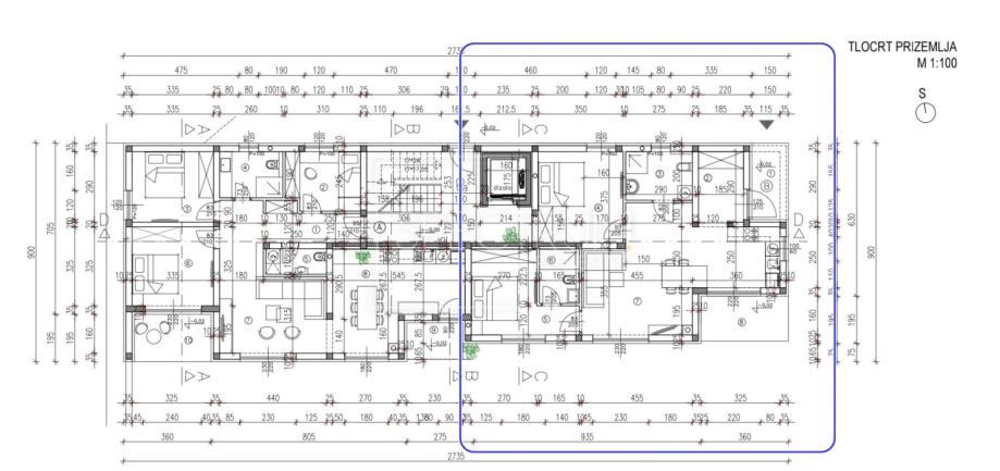 Stan se nalazi u prizemlju novoizgrađene stambene zgrade sa 11 stambenih jedinica. Površina stana iznosi 75.68 m2. Stan se sastoji od dnevnog boravka sa kuhinjom i blagovaonicom open space koncepta, 2 spavaće sobe, 2 kupaonice, ulaznog prostora i natkrivene terase. Na terasu se dolazi iz kuhinje. Sa terase se izlazi na ograđeni vrt površine 80 m2.