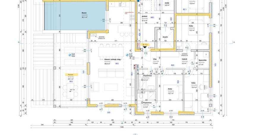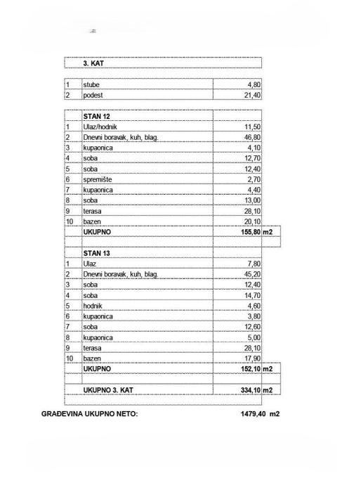 Prodaje se penthouse od 155.8 m2 sa bazenom od 20.10 m2.Stan S12 nalazi se na 3. katu zgrade sa liftom a sastoji se od hodnika, kuhinje sa blagovaonicom i dnevnim boravkom, tri spavaće sobe, dvije kupaonice , ostave , terase ud 28.10 m2 i bazena od 20.10 m2. Električno podno grijanje u kupatilu , a u sobama i dnevnom boravku biti će postavljeni klima uređaji. Postavit će se kvalitetna keramika u dnevnom prostoru i kupatilu i parket u spavaćim sobama.