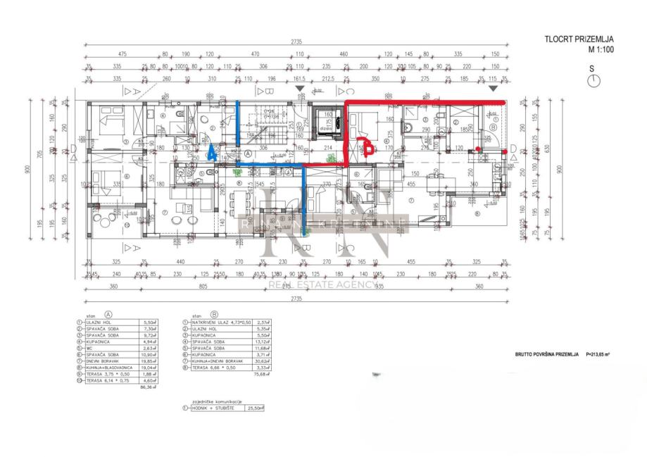 U prizemlju se nalaze dva stana te zajednički bazen namijenjen isključivo tim stanovima, što stanovima u prizemlju daje dodatnu vrijednost, privatnost i osjećaj kao u kući s vlastitim bazenom.
