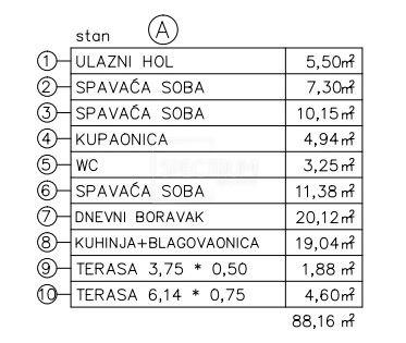 Stan se nalazi u prizemlju novoizgrađene stambene zgrade sa 11 stambenih jedinica. Površina stana iznosi 88.16 m2. Stan se sastoji od dnevnog boravka sa kuhinjom i blagovaonicom open space koncepta, 3 spavaće sobe, kupaonice, wc-a, hodnika i 2 natkrivene terase. Na jednu terasu se izlazi iz kuhinje, a na drugu terase se izlazi iz spavaće sobe. Sa terasa se izlazi na ograđeni vrt površine 80 m2.