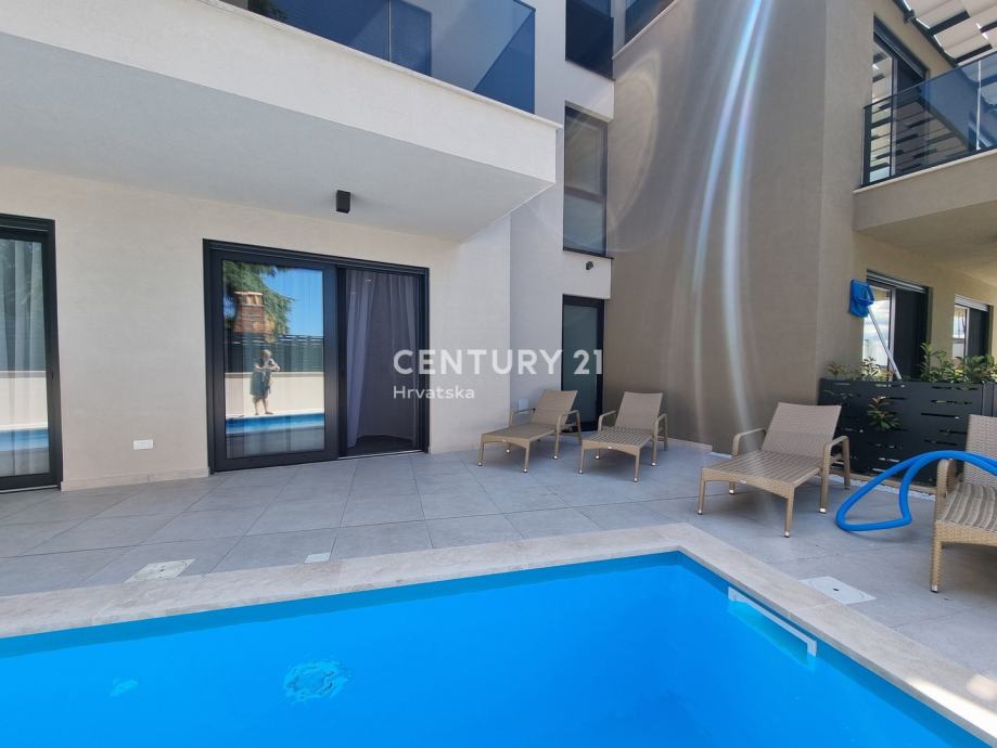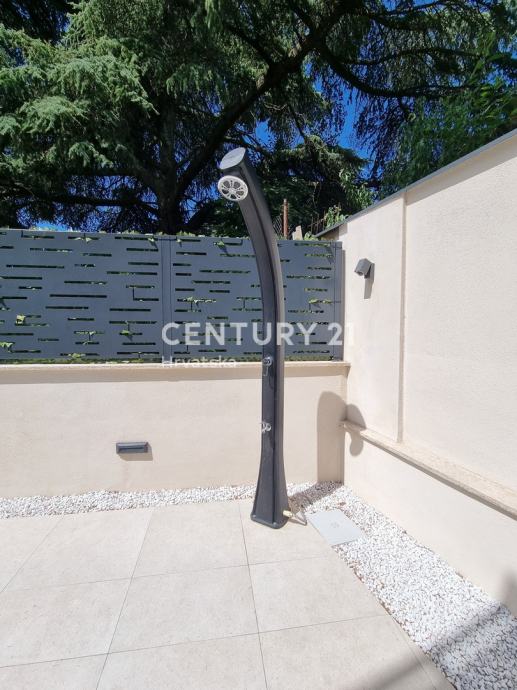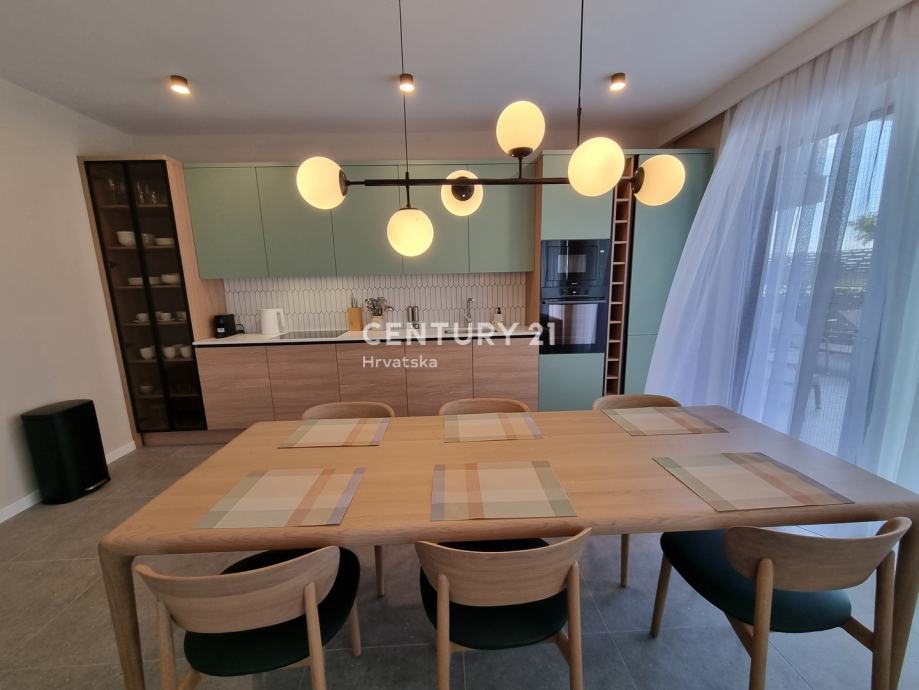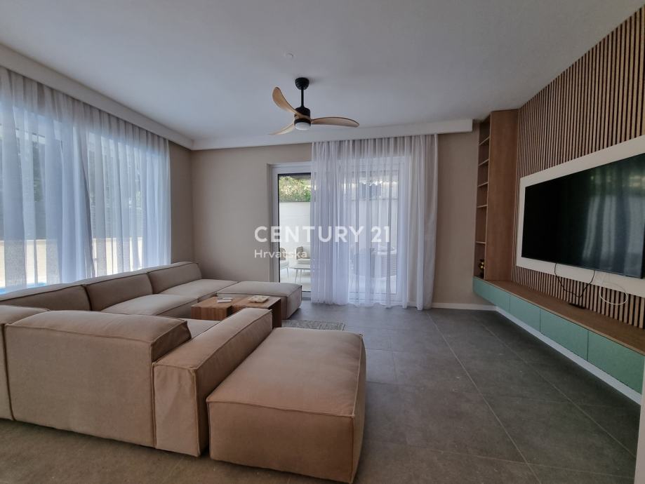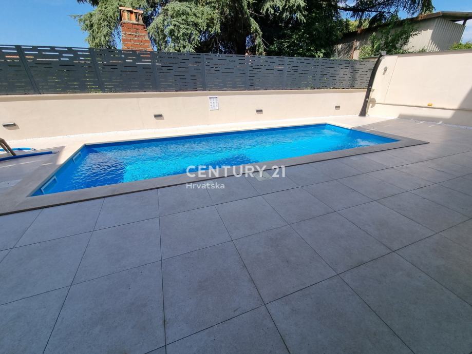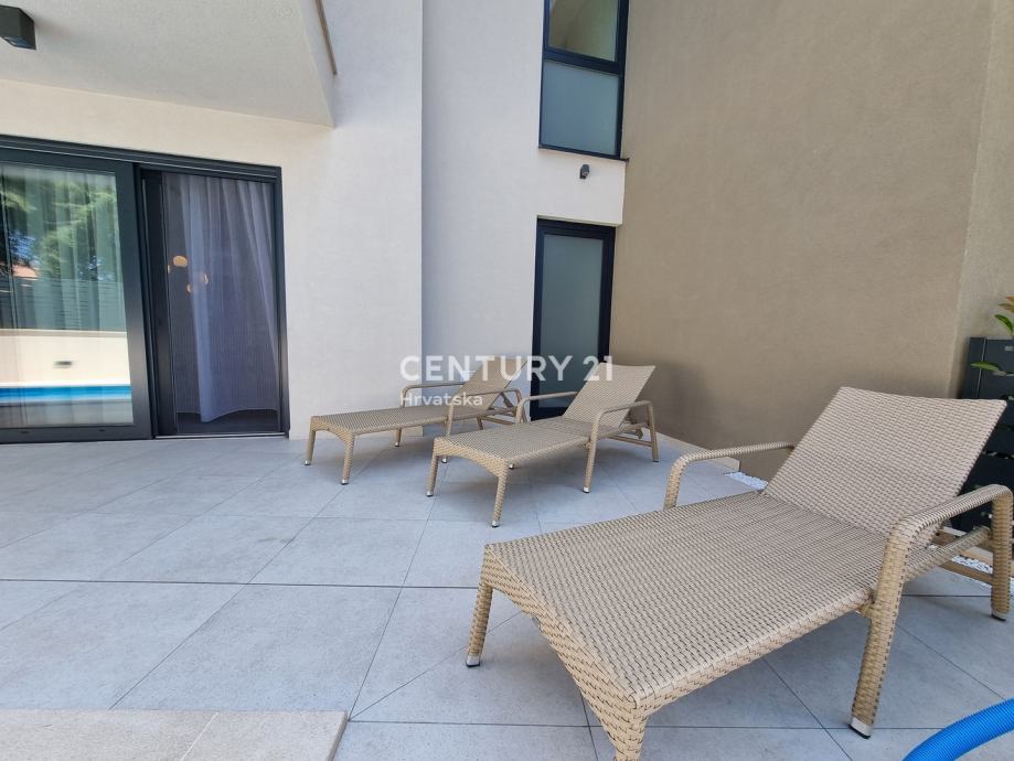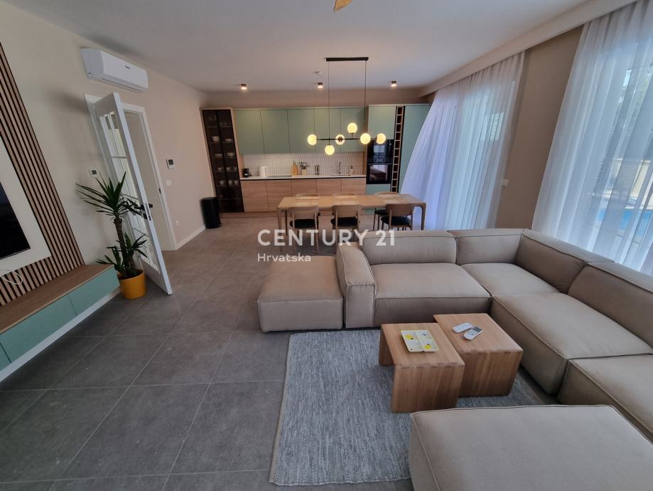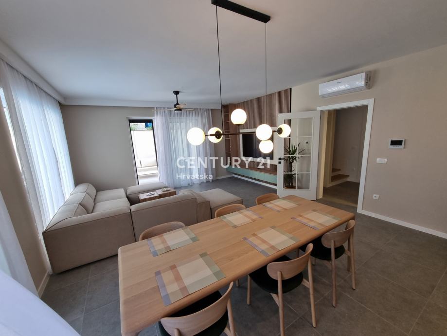 Sastoji se od prizemlja i 1. kata. U prizemlju se nalazi hodnik, praonica, wc, kupaonica, spavaća soba, spremište, kuhinja, blagovaonica i dnevni boravak (open space od 37,60 m2) te natrkivena terasa od 12,90 m2. Unutarnjim se stepenicama odlazi na kat gdje su smještene još dvije spavaće sobe sa dvije kupaone, hodnik, te zajednički balkon od 10,60 m2. Iz dnevnog prostora u prizemlju se odlazi u vrt od 97 m2, gdje je smješten bazen od 17,50 m2, tuš, te uređena i ograđena okućnica. Stanu pripada i jedno parkirno mjesto od 12,50 m2 i spremište od 7,67 m2.