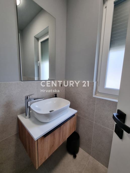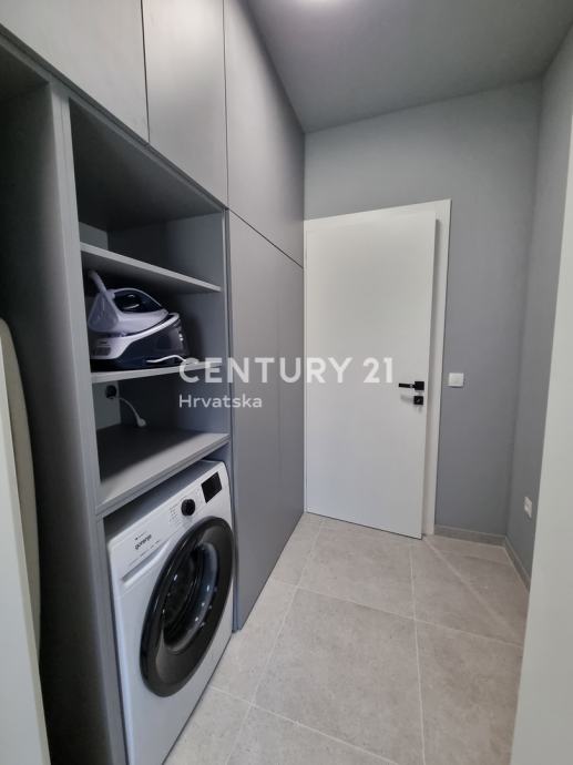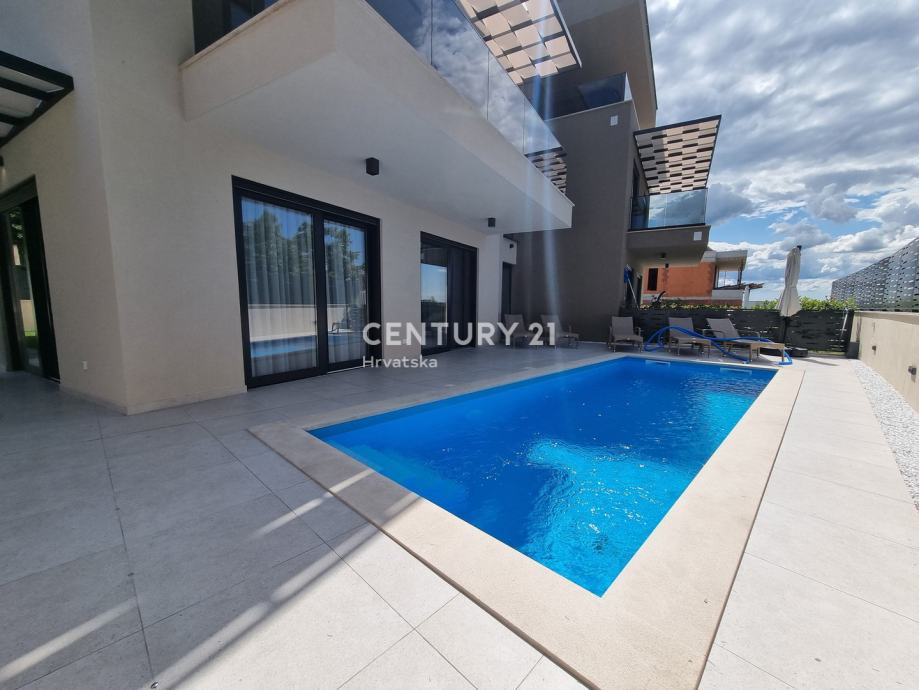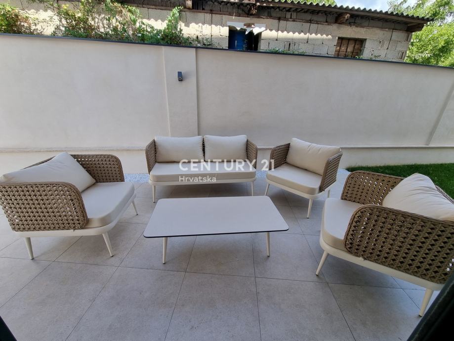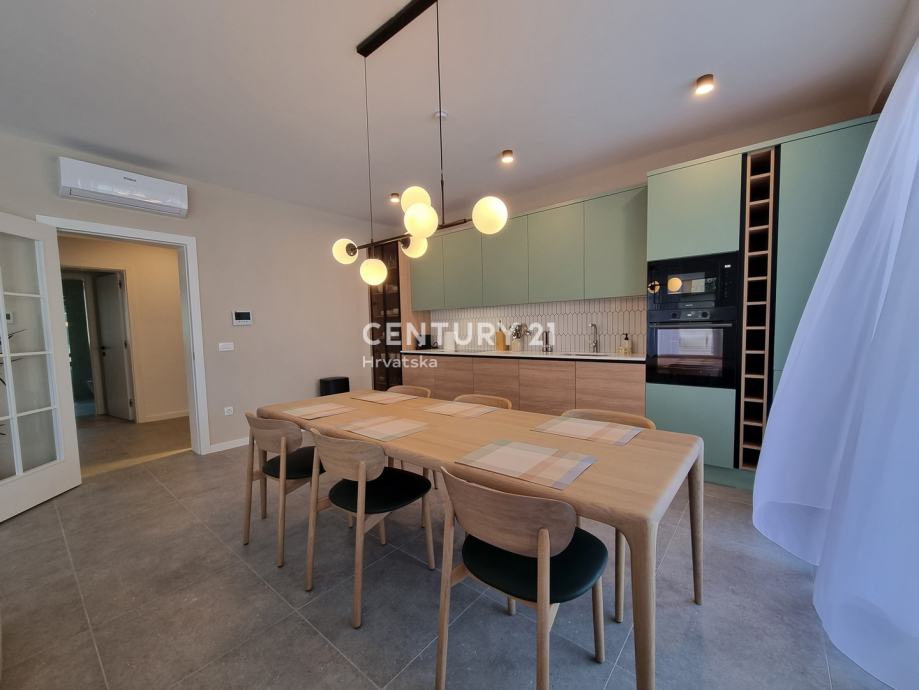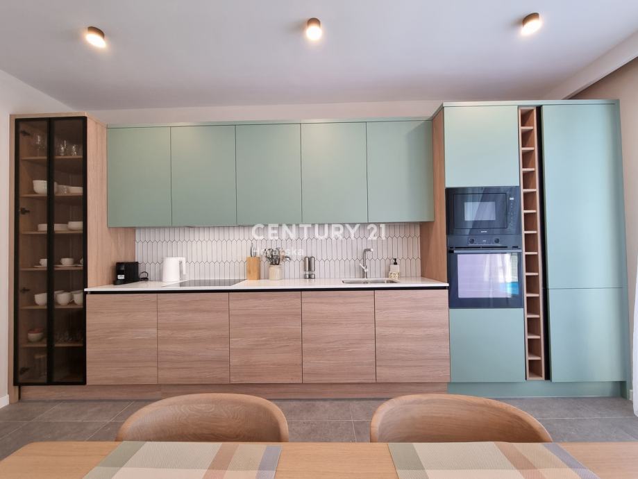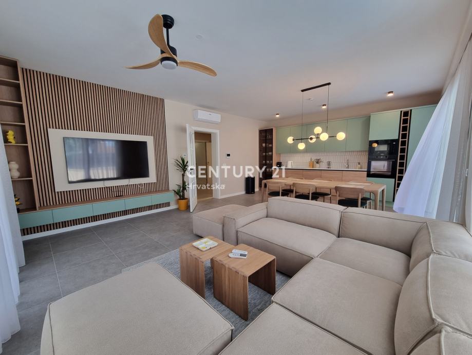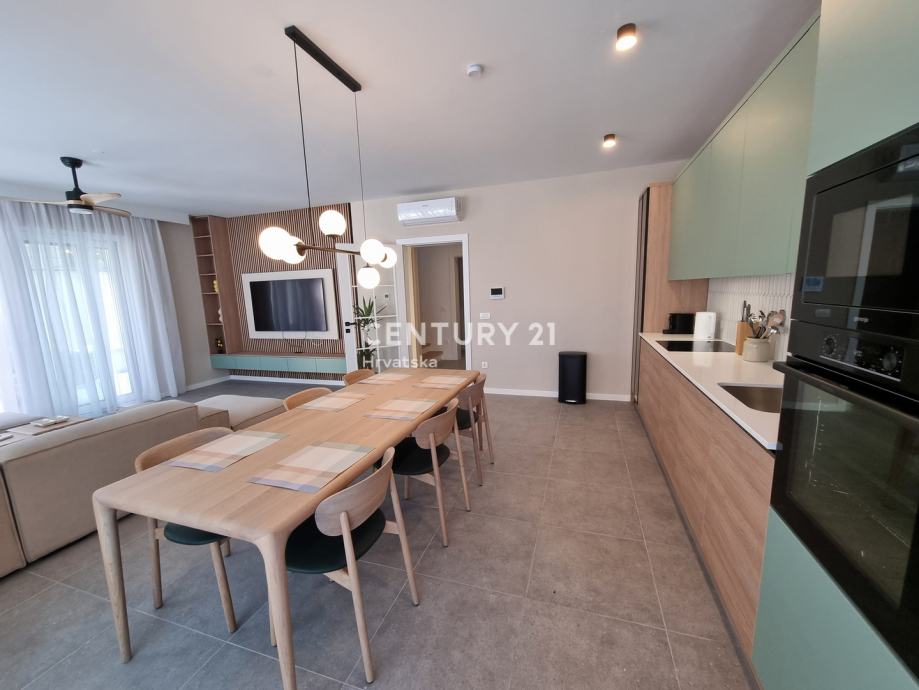 Sastoji se od prizemlja i 1. kata. U prizemlju se nalazi hodnik, praonica, wc, kupaonica, spavaća soba, spremište, kuhinja, blagovaonica i dnevni boravak (open space od 37,60 m2) te natrkivena terasa od 12,90 m2. Unutarnjim se stepenicama odlazi na kat gdje su smještene još dvije spavaće sobe sa dvije kupaone, hodnik, te zajednički balkon od 10,60 m2. Iz dnevnog prostora u prizemlju se odlazi u vrt od 97 m2, gdje je smješten bazen od 17,50 m2, tuš, te uređena i ograđena okućnica. Stanu pripada i jedno parkirno mjesto od 12,50 m2 i spremište od 7,67 m2.