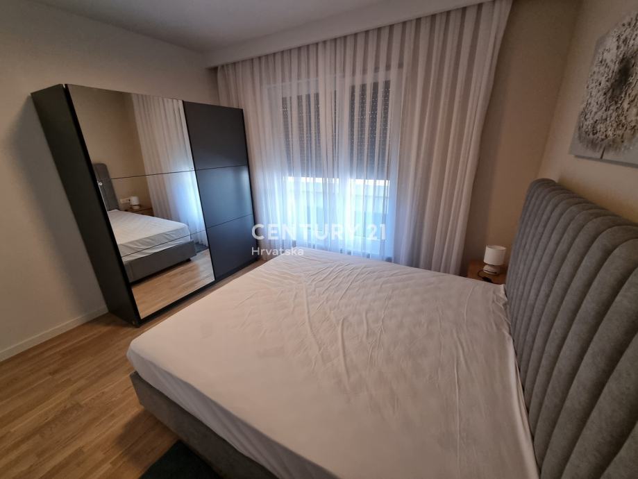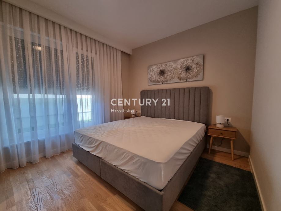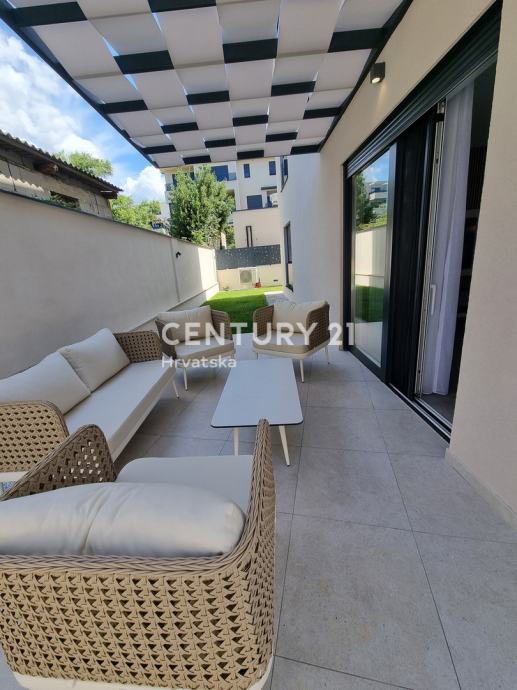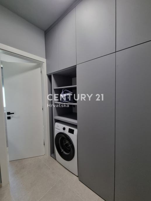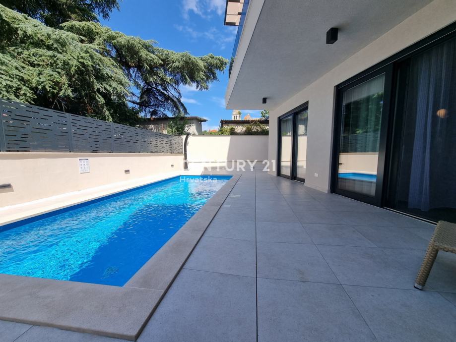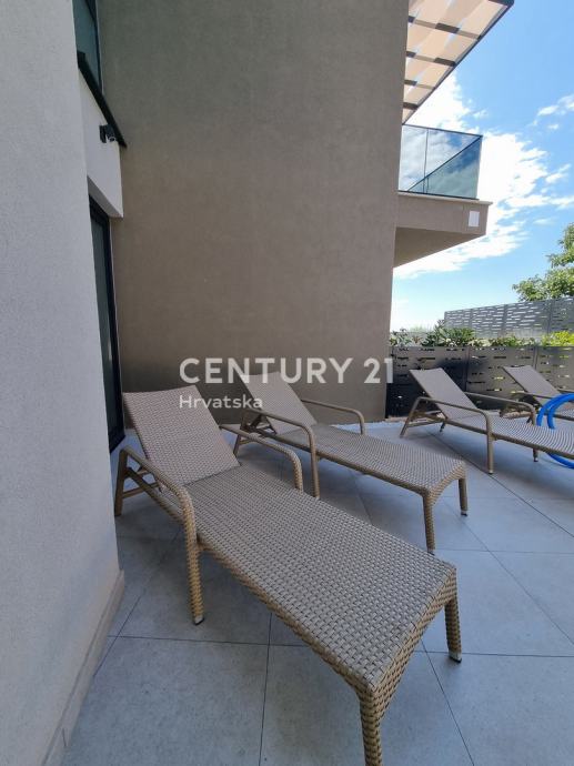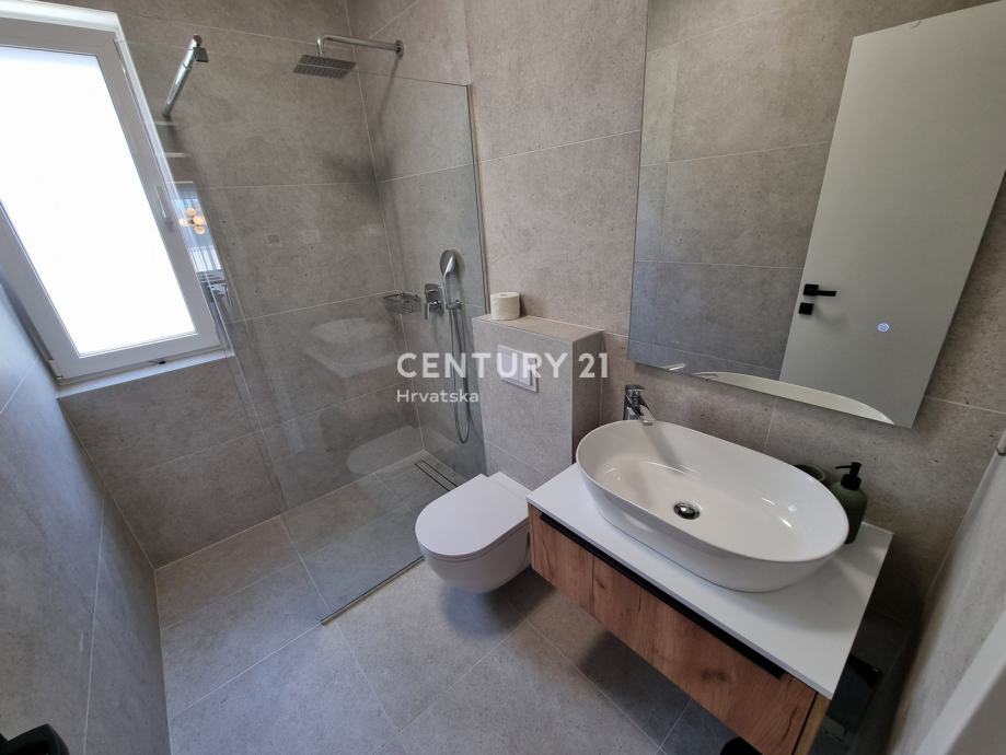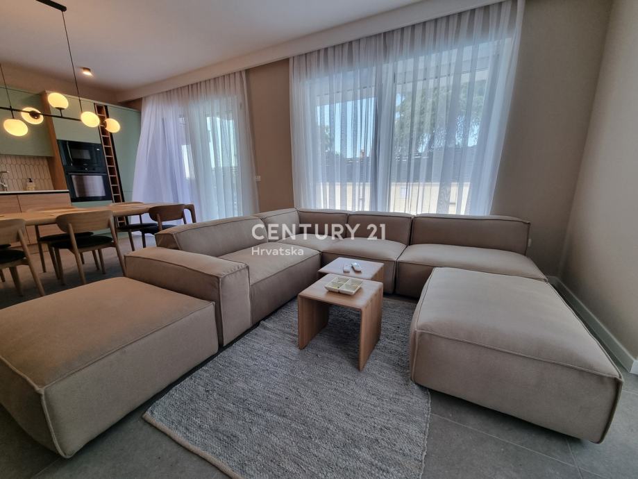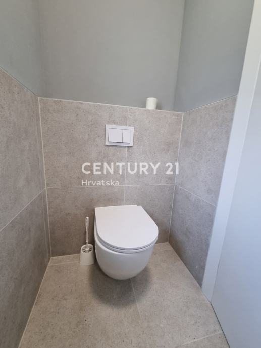 Sastoji se od prizemlja i 1. kata. U prizemlju se nalazi hodnik, praonica, wc, kupaonica, spavaća soba, spremište, kuhinja, blagovaonica i dnevni boravak (open space od 37,60 m2) te natrkivena terasa od 12,90 m2. Unutarnjim se stepenicama odlazi na kat gdje su smještene još dvije spavaće sobe sa dvije kupaone, hodnik, te zajednički balkon od 10,60 m2. Iz dnevnog prostora u prizemlju se odlazi u vrt od 97 m2, gdje je smješten bazen od 17,50 m2, tuš, te uređena i ograđena okućnica. Stanu pripada i jedno parkirno mjesto od 12,50 m2 i spremište od 7,67 m2.