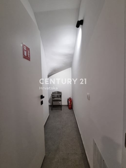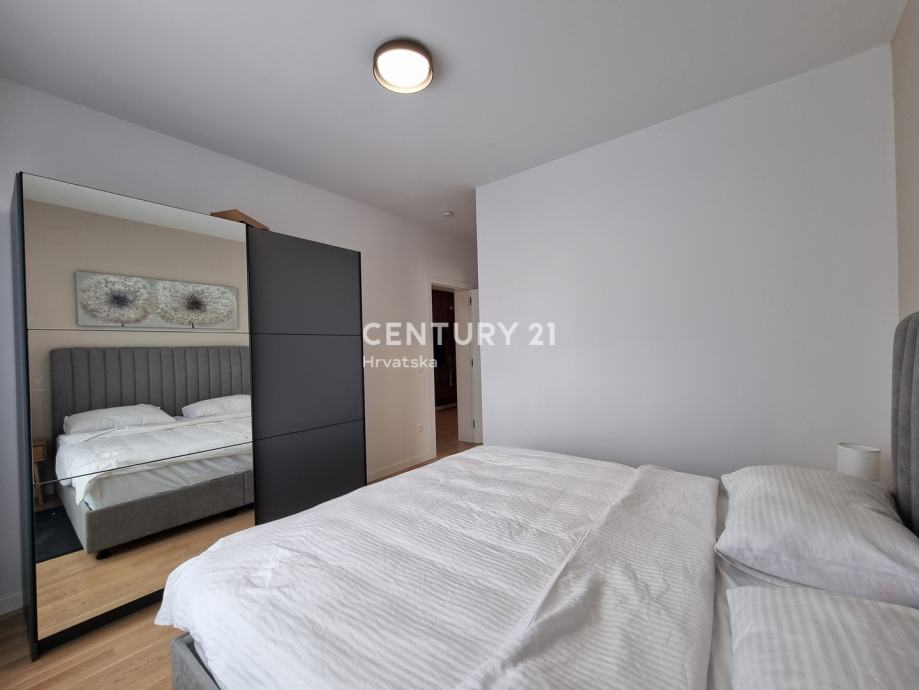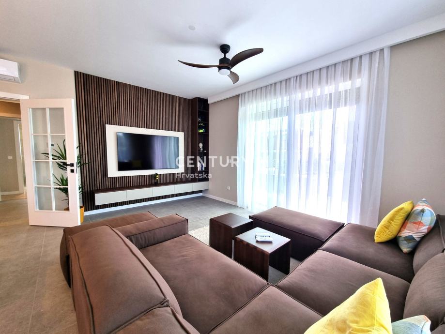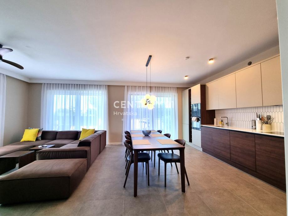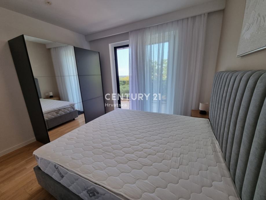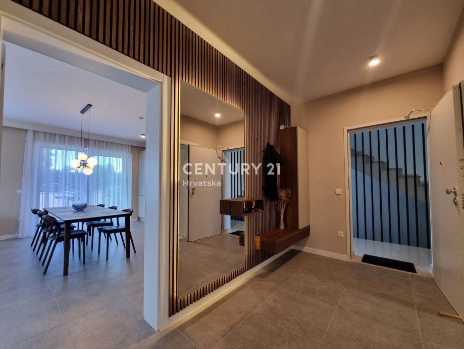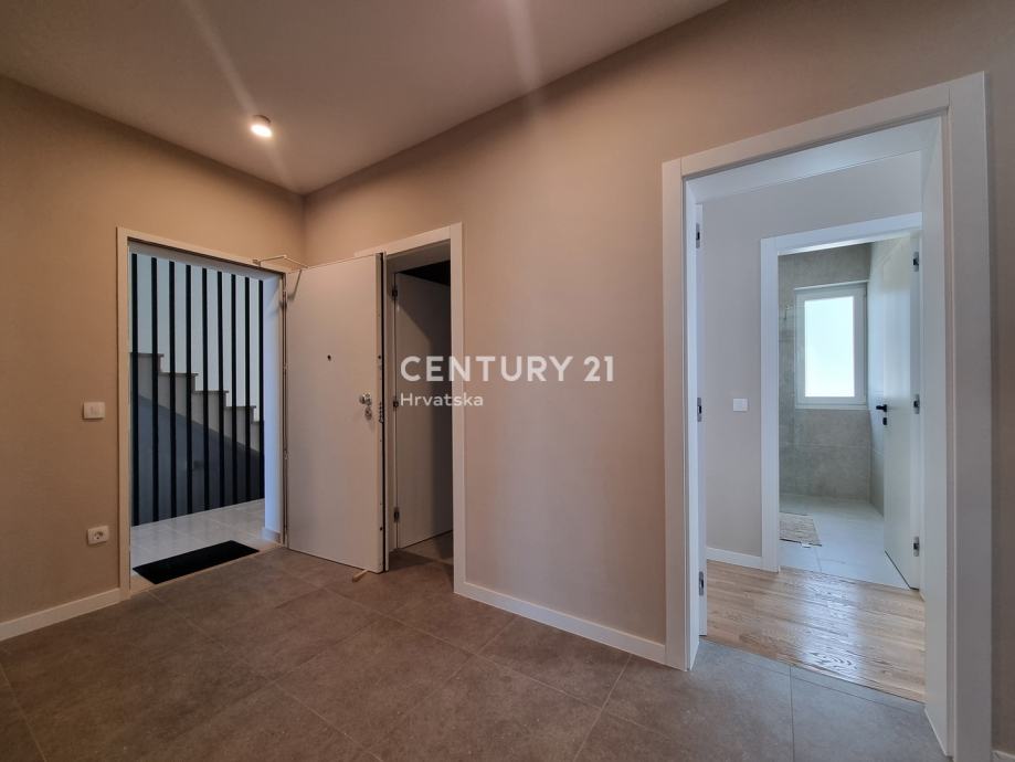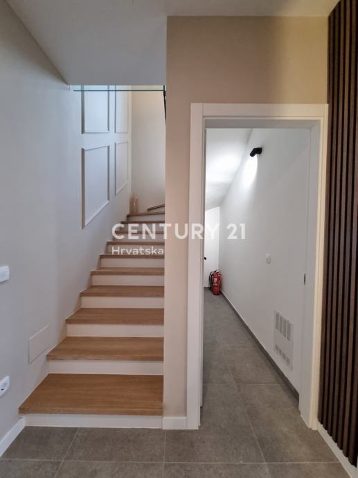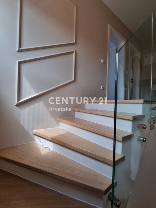 Unutarnjim se stepenicama odlazi na kat gdje su smještene još dvije spavaće sobe sa dvije kupaone, hodnik, te zajednički balkon od 10,60 m2. Iz dnevnog prostora u prizemlju se odlazi u vrt od 159 m2, gdje je smješten bazen od 17,50 m2, tuš, te uređena i ograđena okućnica. Stanu pripada i jedno parkirno mjesto od 12,50 m2 i spremište od 7,67 m2.