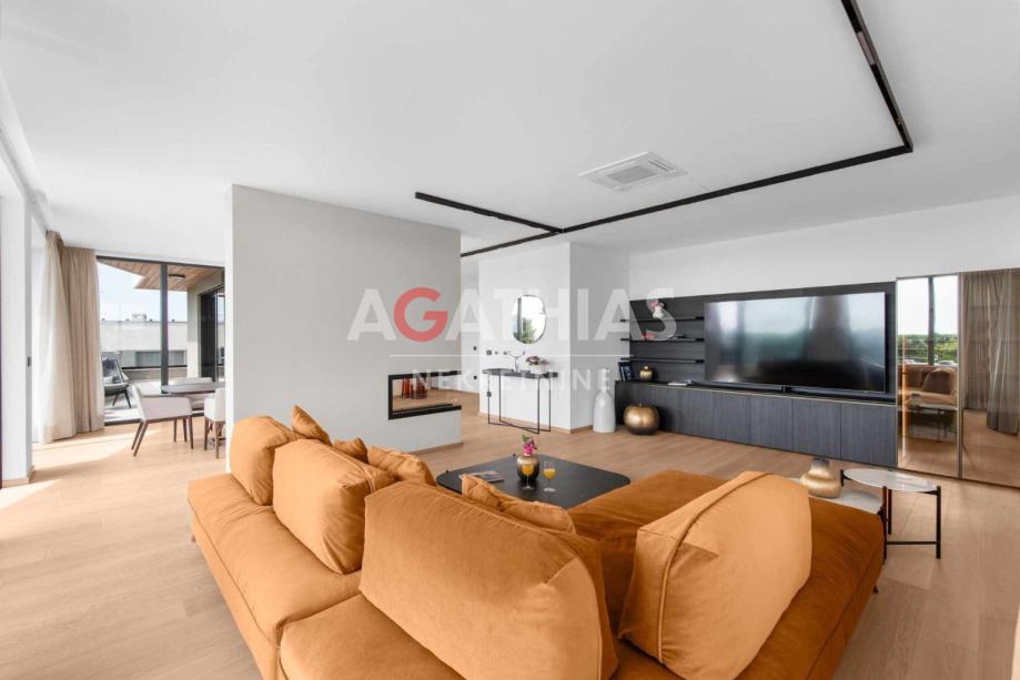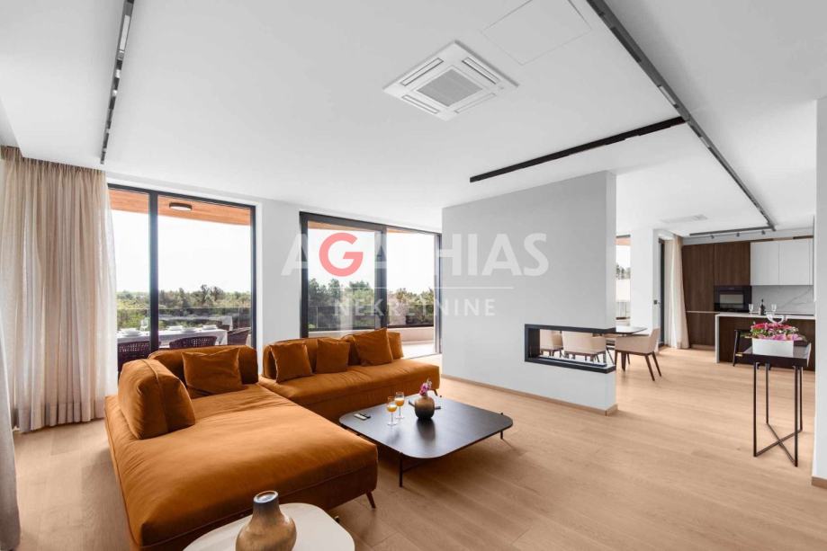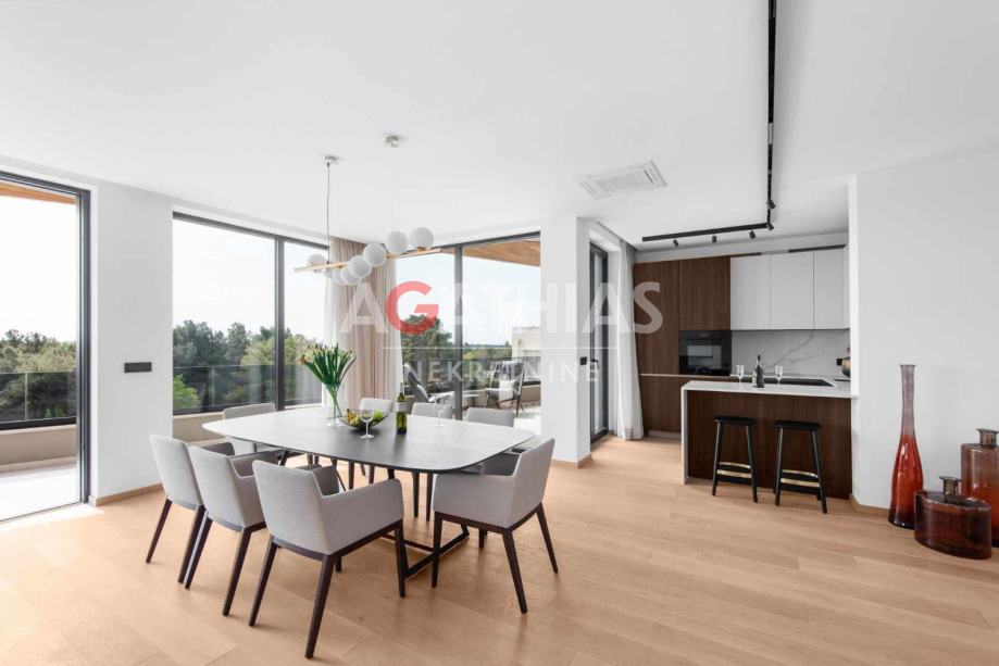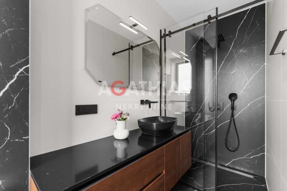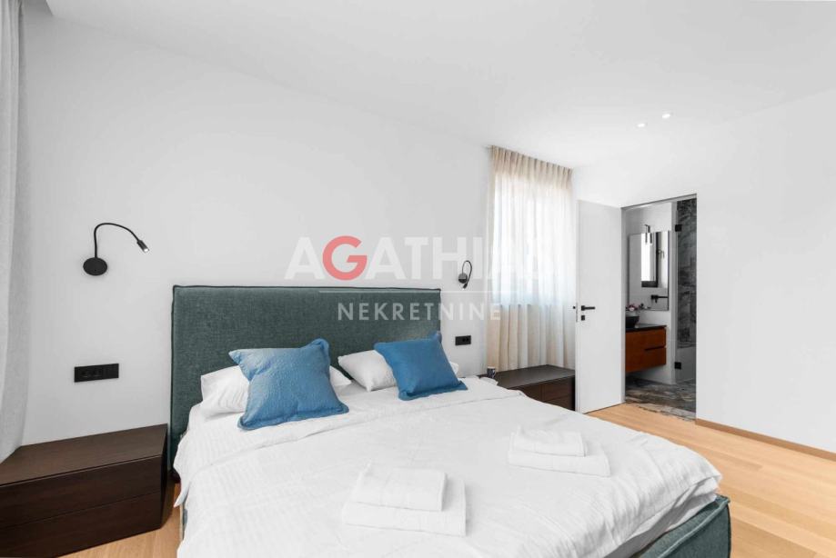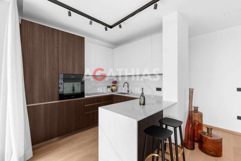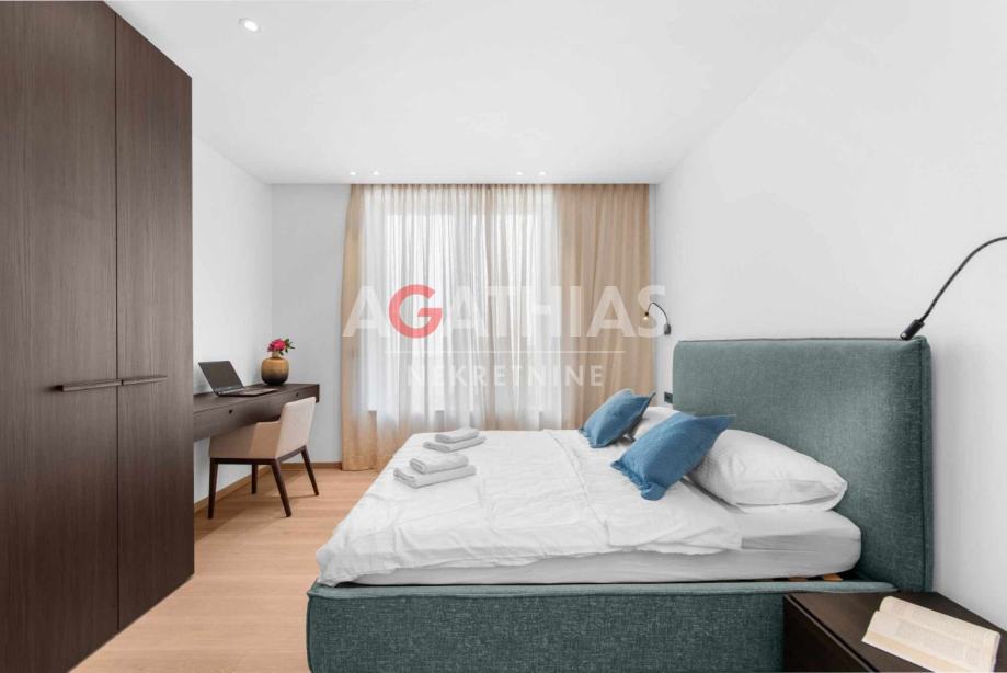 Stan je opremljen pažljivo biranim komadima talijanskog dizajnerskog namještaja Novamobili, vrhunskim Miele uređajima, Hansgrohe Metropol sanitarijama u mat crnoj izvedbi, podnim grijanjem upravljivim putem aplikacije i klimatizacijom najnovije generacije. Sve je izvedeno s izuzetnom pažnjom na detalje – od troslojnog hrastovog parketa, do skrivenih sobnih vrata Garofoli i aluminijske stolarije Wicona s troslojnim staklom.