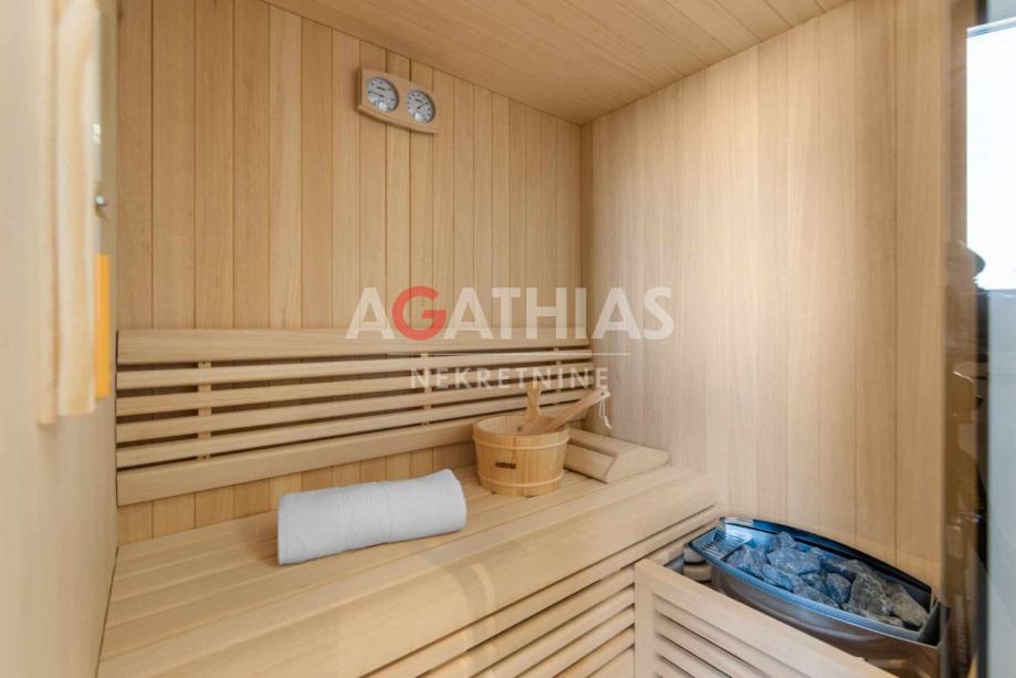 Otvoren i prozračan dnevni prostor povezuje elegantnu blagovaonicu i suvremeno opremljenu kuhinju, stvarajući savršen ambijent za opuštanje i druženje. Tri prostrane spavaće sobe, svaka sa svojom kupaonicom, pružaju potpunu udobnost i intimnost. Posebnu notu daje master suite s vlastitom saunom – vaše osobno spa utočište.