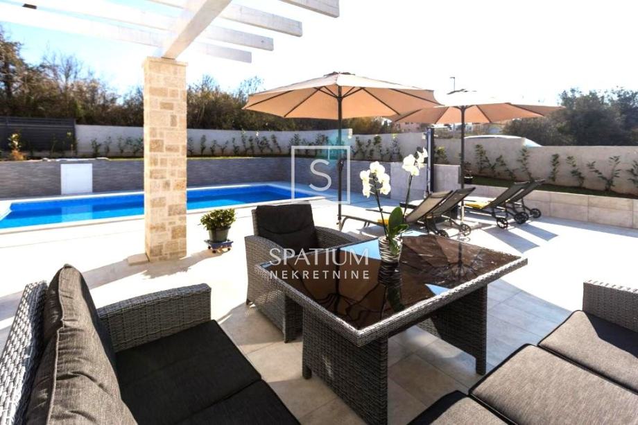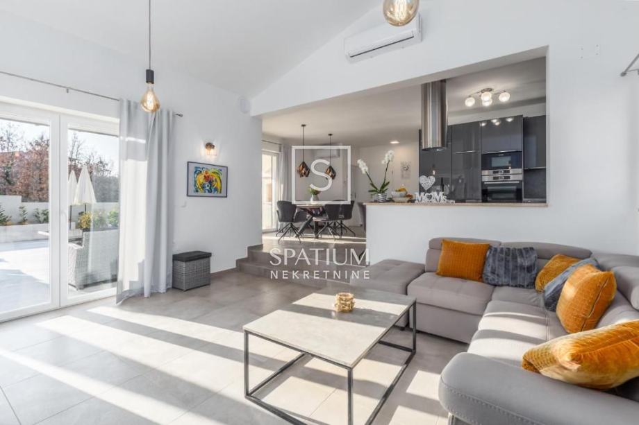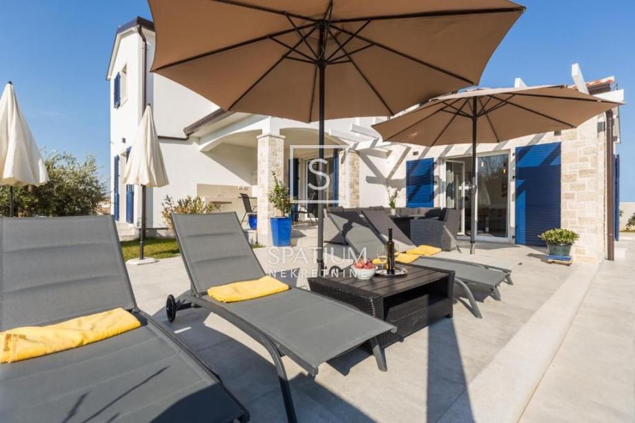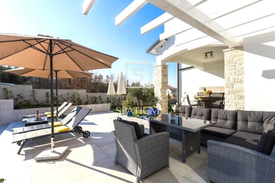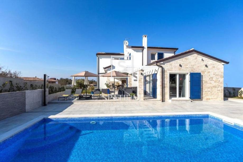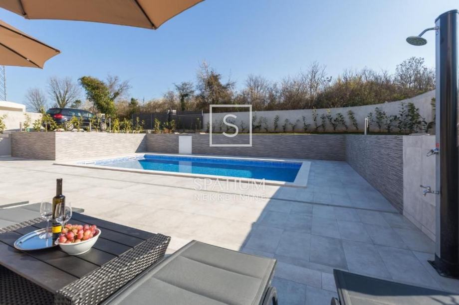 NOVIGRAD, TAR, u ponudi je vila sa bazenom smještena na zemljištu površine 650 m2. Izgrađena je 2021. godine. U prizemlju se nalazi dnevni boravak sa kuhinjom i blagovaonom, spavaća soba, kupaona, toalet i vešeraj. Na katu su dvije spavaće sobe, svaka sa svojom kupaonom i sa izlazom na zajedničku terasu. Kuća je klimatizirana, a svi prostori, osim spavaćih soba, grijani su podnim grijanjem. Na okućnici se nalazi bazen od 32 m2, sunčalište te natkrivena terasa gdje je i roštilj.