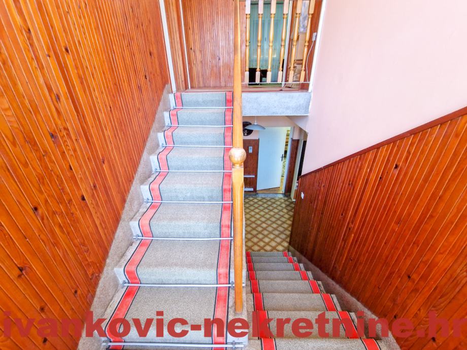 Na katu se nalazi velika prostrana kupaonica s kadom, 3 sobe i ostava iz koje se ide na tavan. Moguće proširiti stambeni prostor i napraviti potkrovlje. Na katu se nalaze balkoni i terasa.