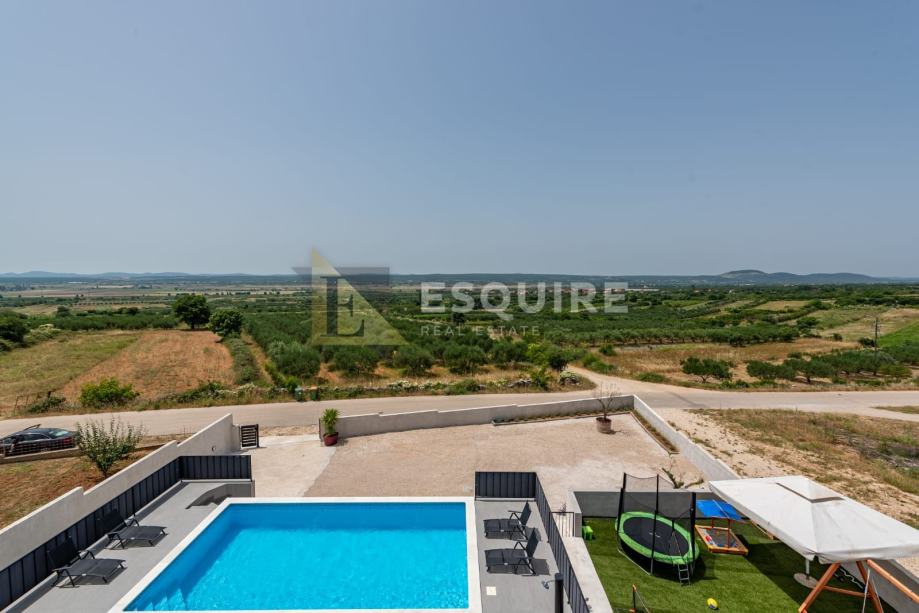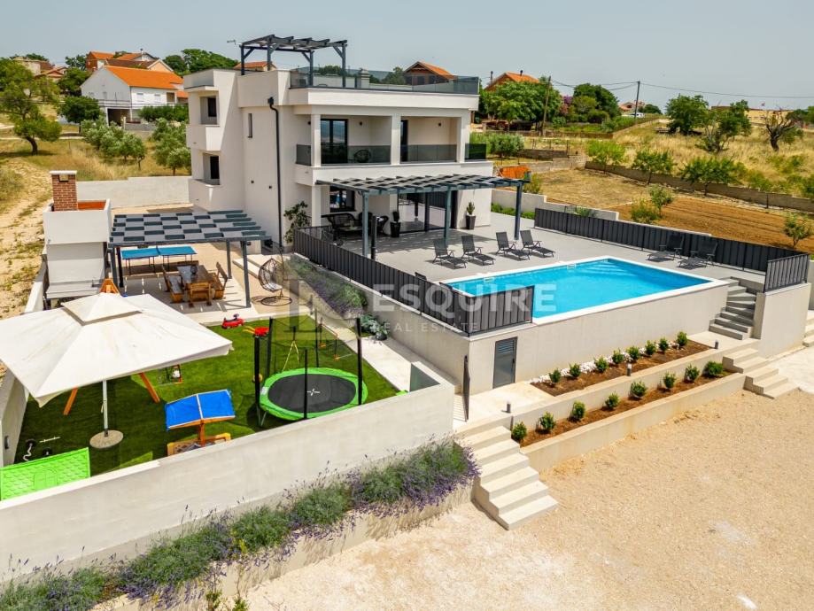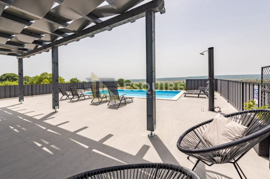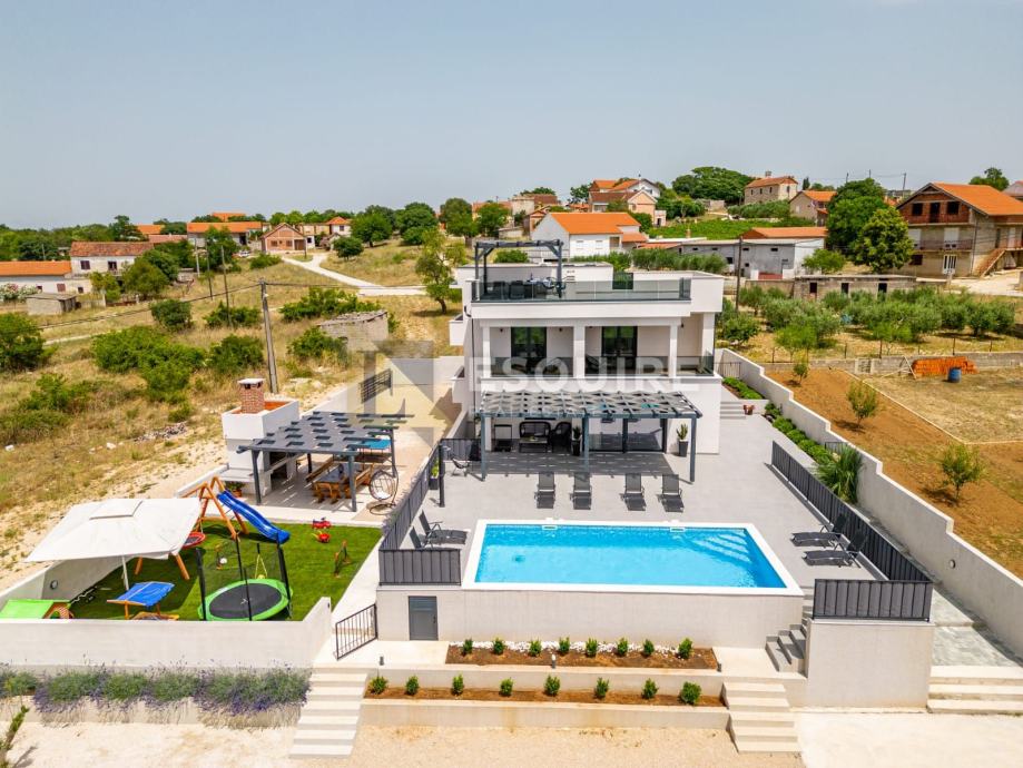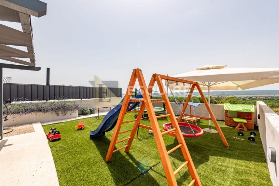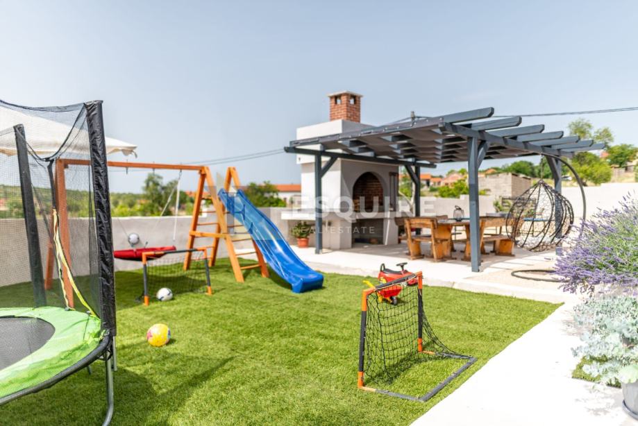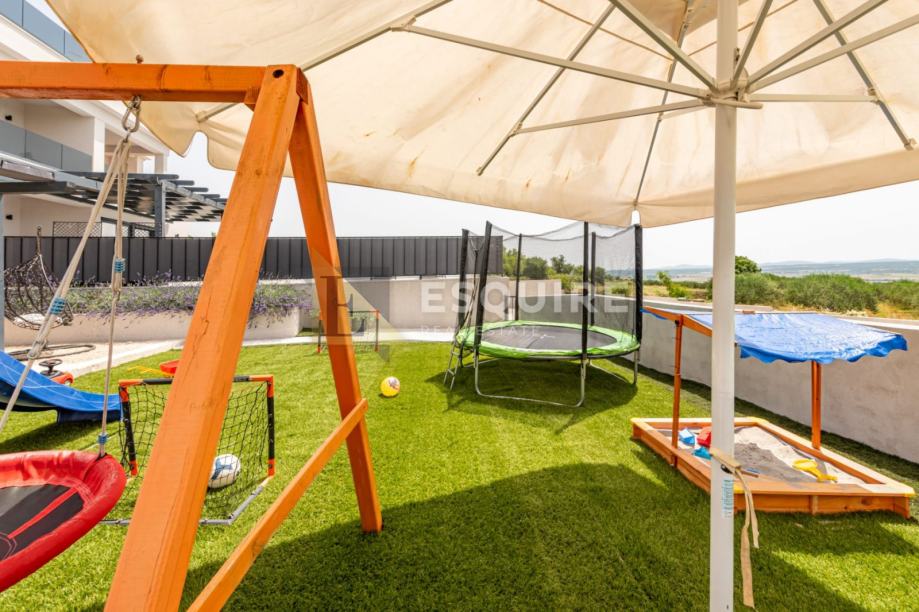 Vanjski dio uključuje prostrano dvorište s bazenom i s igralištem za djecu, idealno za bezbrižno uživanje najmlađih.