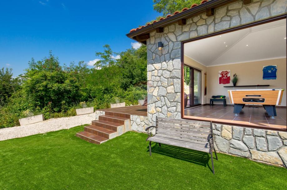 Vila je smještena na ograđenoj okućnici površine 700 m2 na kojoj se nalazi bazen sa sunčalištem, kamena kućica sa stolom za biljar, stolni tenis i lounge kutak za opuštanje.