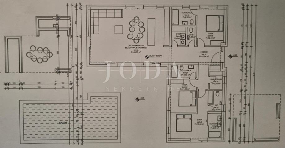 -Kuća je smještena na parceli od 1103 m2, površina kuće 134,70 m2 + ljetna kuhinja (s wc-om i skladišnim prostorom) 31,82 m2, + natkriveni parking 27,69 m2 + bazen 55 m2 (11m x 5m)