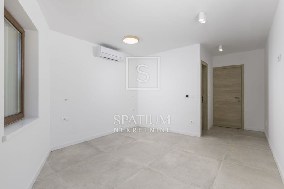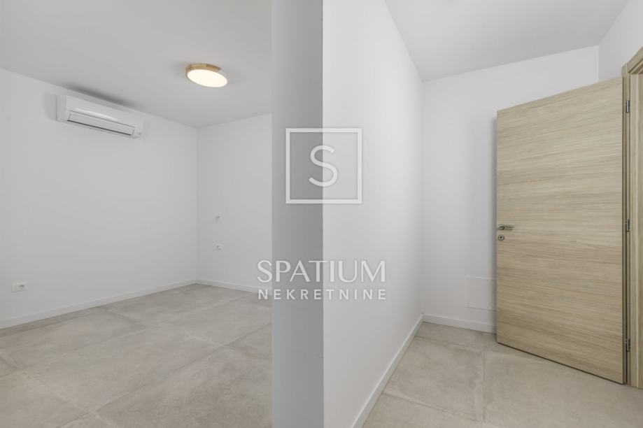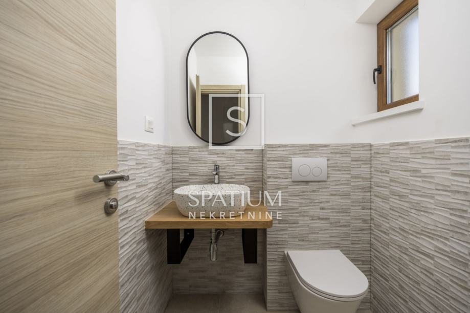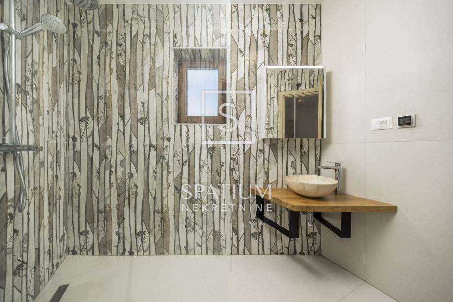 Opremljena je električnim podnim grijanjem s individualnom regulacijom, dizalicama topline Mitsubishi, klima uređajima u svim prostorijama, punjačem za električna vozila i sustavom video nadzora. Velike klizne stijene s troslojnim sigurnosnim staklom osiguravaju obilje prirodnog svjetla, dok protuprovalna vrata pružaju dodatnu sigurnost, a kvalitetna toplinska izolacija i keramika velikih formata potvrđuju visoki standard gradnje. Okućnica je potpuno uređena, ograđena i opremljena električnim ulaznim vratima.