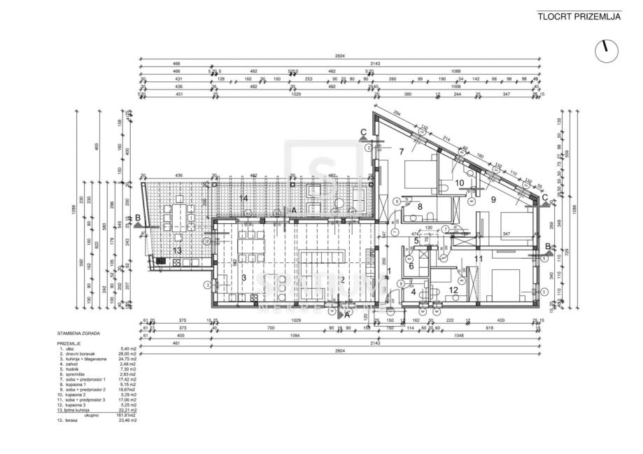 Kuća se sastoji od prostranog dnevnog boravka otvorenog tipa s kuhinjom i blagovaonicom, ukupne površine 52,75 m², s kaminom i direktnim izlazom na natkrivenu terasu, grijani bazen od 35 m² i ljetnu kuhinju. U sklopu kuće nalaze se tri spavaće sobe, svaka s vlastitom kupaonicom.